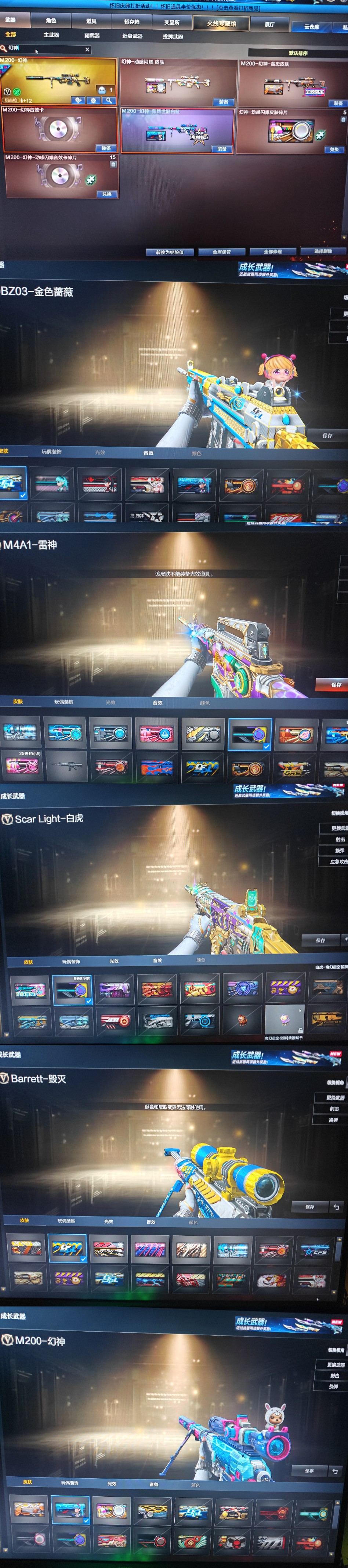手下留情! 爆破号,生化号,幻神皮是老白鲨皮,有冠军小刀,4炼狱炼狱小刚和6烈蝴蝶,还有黄金冰龙啥的;柯尔特-冠军之特,炽芒蝶刃,Knife-冠军之刃,传说女帝,电竞教官-云悠悠,QBZ03-金色蔷薇,M200-幻神,