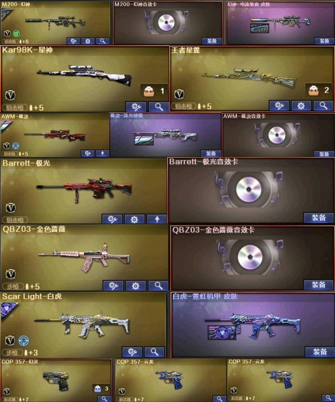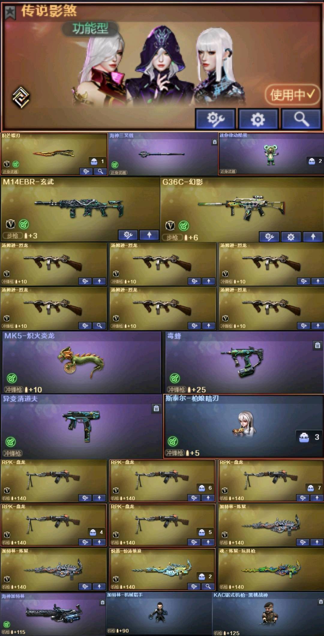 传说影煞.炽芒蝶刃.幻神+裁决三件套.清道夫.G36C幻影.6烈6盘.枪娘.星神.毒蜂.玄武全猎手皮