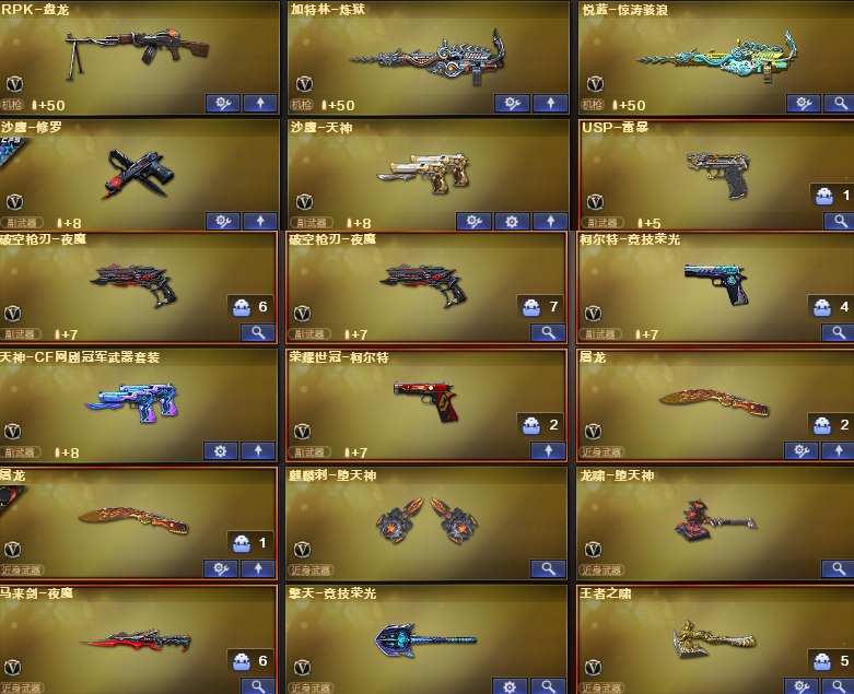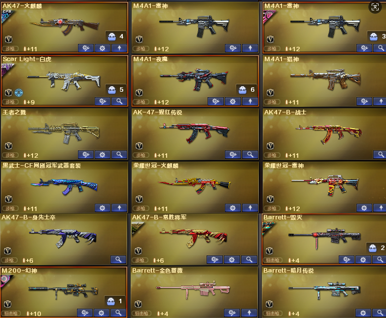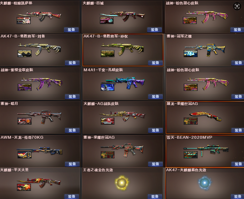 幻神+宠儿皮肤+冠军之幻+音效卡/白虎暗星+音效/荣耀世冠套/6音效卡(火麒麟雷神黑骑士毁灭白虎幻神音效卡)/炼狱悦蓝-惊涛骇浪毁灭2018+2020MVP/雷神冠军之魄+雷神宠儿/白虎暗星皮肤/荣耀世冠AG/幻神宠儿+冠军之幻/火麒麟枪娘凯萨琳等等;USP-雷暴,荣耀世冠-柯尔特,电竞教官-云悠悠,RPK-盘龙,M200-幻神,Scar Light-白虎,