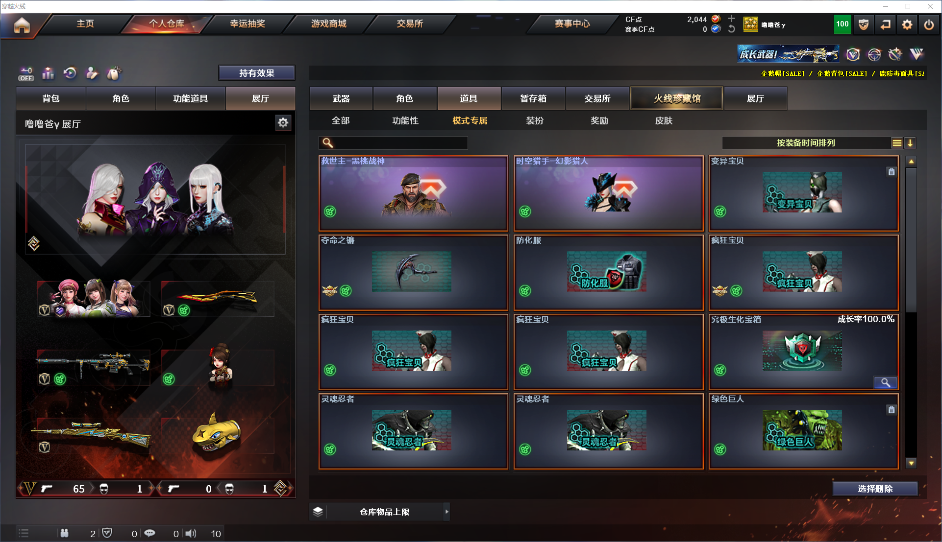 好用请点击收藏 谢谢! 角色:三防传说影煞 3防晴雅 皮肤:时空猎手-幻影猎人 武器:6烈龙 斯泰尔-蝴蝶 炽芒蝶刃 黄金猫猫手套-白鲨 云龙套,迷你生化手雷,生化弹夹,M200-幻神,王者星霆,QBZO3-金色蔷薇 道具:冲峰枪弹夹,手枪弹夹27/2/1,步枪弹夹26/6/1,生化弹夹,防护服 ,夺命之镰,变异宝贝,白鲨战队对讲机,C4工具钳,手雷包,防弹衣 防弹帽,烟雾保护头盔;USP-雷暴,炽芒蝶刃,传说影煞,晴雅,QBZ03-金色蔷薇,M200-幻神,Scar Light-白虎,