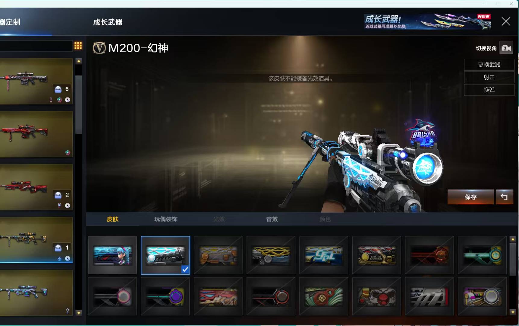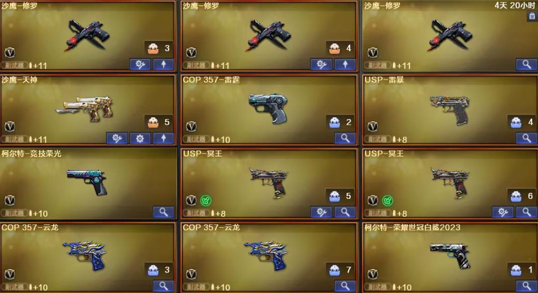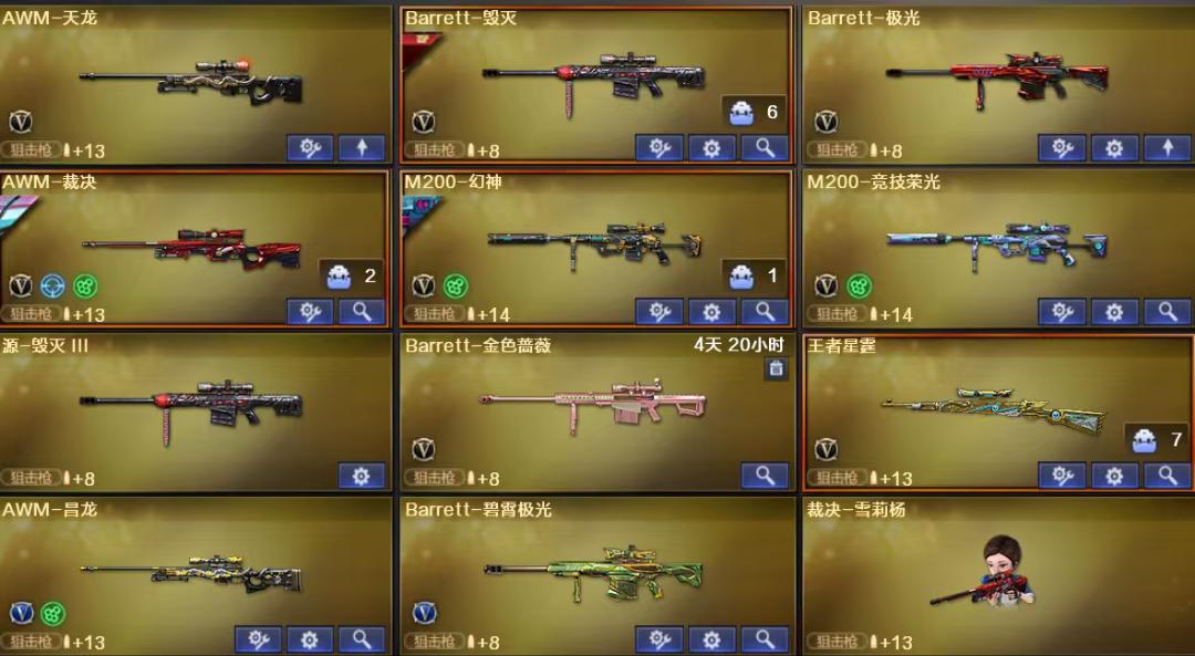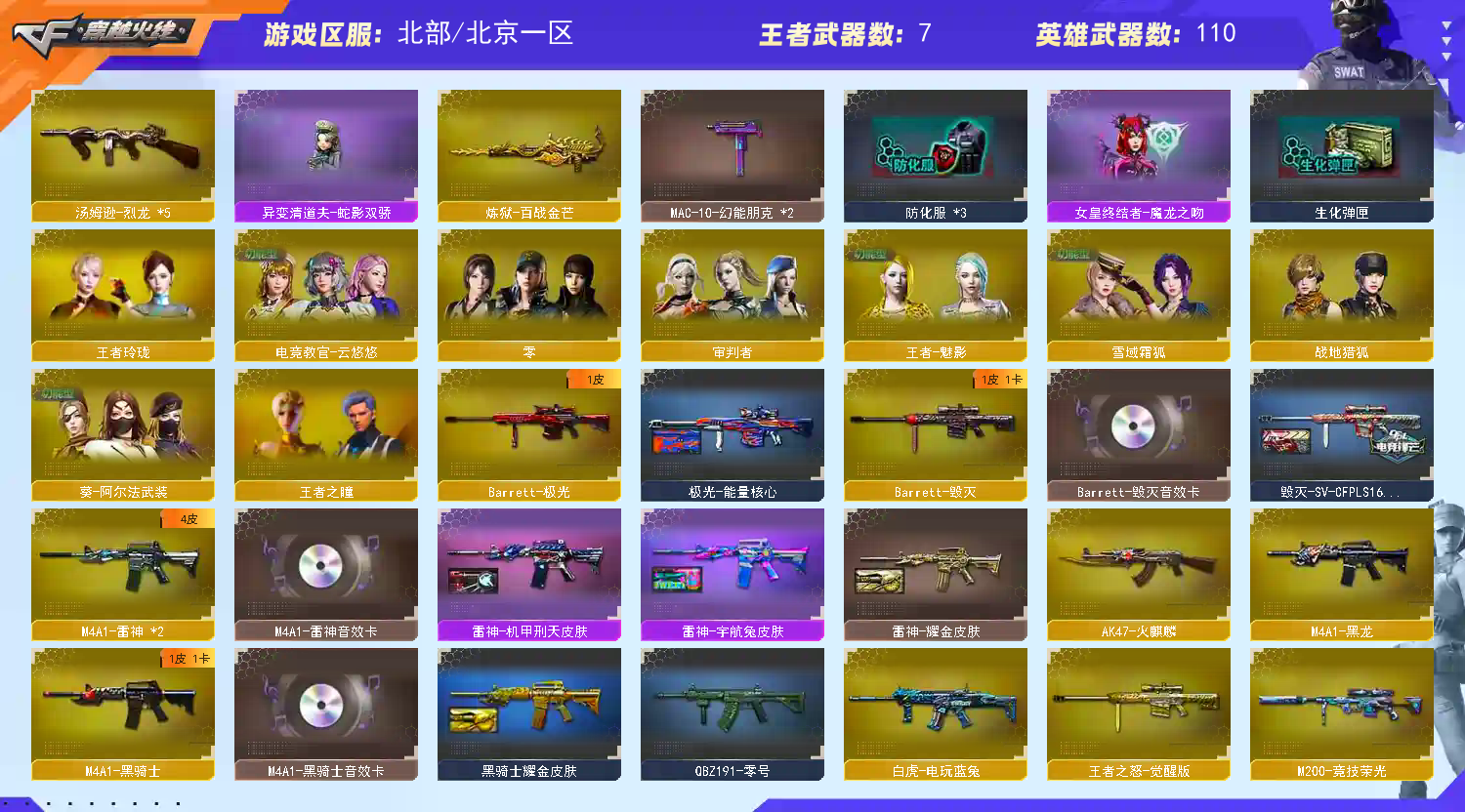 爆破∶传说圣谕 天袭 天绒 妮妮 幻神音效卡+白鲨皮肤x2+白鲨投影 白虎+白鲨皮肤+冠军之虎+音效卡+白鲨投影 98k王者星霆 裁决音效卡+流光秘银+叶芒苍岭+运输船+羽擎+风灵 qbz金色蔷薇+ag皮肤+拼搏皮肤+电竞之星 雷神蓝粉光效+耀金皮肤+诺拉皮肤+雷神音效卡 黑骑士蓝粉光效+音效卡+耀金皮肤 g36c幻影 白虎电玩蓝兔 7主流副武器∶ cop∶云龙x2 雷霆x1 sup∶雷暴x1 冥王x2 柯尔特∶白鲨x1 竞技荣光x1 荣耀世冠epx1 qbz音效卡 修罗x5 天神x1 生化∶斯泰尔蝴蝶 蛇影双娇清道夫 烈龙x5 生化属性云悠悠 生化弹夹;USP-雷暴,柯尔特-荣耀世冠白鲨2023,电竞教官-云悠悠,妮妮,QBZ03-金色蔷薇,G36C-幻影,M200-幻神,