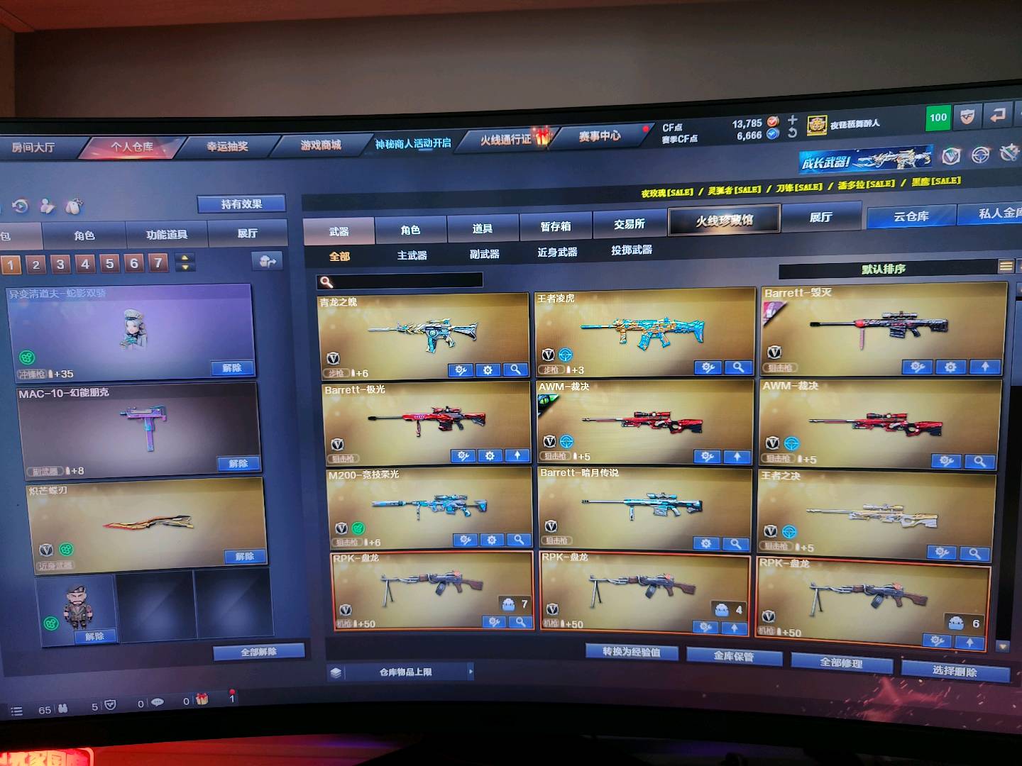 生化爆破号影煞晴雅,八面玲珑蝴蝶清道夫异变镇魔者炼狱夏佐6烈5盘,三把蝴蝶刀幻影,王者凌虎,绝代双骄清道夫。;USP-雷暴,炽芒蝶刃,传说影煞,晴雅,RPK-盘龙,QBZ03-金色蔷薇,G36C-幻影,