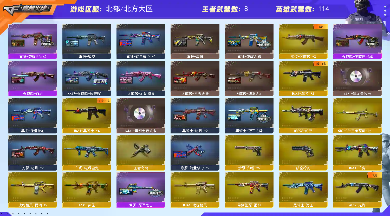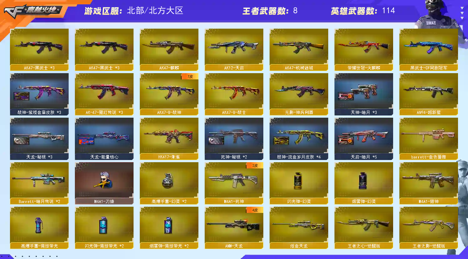 欢迎收藏方便下次租用>>>>>>毁号,涉及毁坏虚拟财产罪及计算机安全罪,请文明游戏素质游戏,让我们共建美好租号平台>>>>>> 本游戏账号:英雄武器114个; 王者武器16个。【幻神巅峰荣耀➕幻神音效卡➕星神➕】6盘6烈朱雀冠军套荣耀套毁灭svぃ⑧音效各种四防 装备不多,但是主武器、副武器、近身武器够用 拥有完美游戏体验。重要的是,特殊装备有:闪光弹-竞技荣光、麒麟刺、擎天-竞技荣光、烟雾弹-竞技荣光、M200-幻神、黑骑士-海王、荣耀世冠-火麒麟、荣耀世冠-雷神、加特林-炼狱、荣耀世冠-柯尔特、HK417-朱雀、AK47-火麒麟、M4A1-玫瑰精灵、玫瑰精灵-悦动、王者之心-觉醒版、炫金雷神、王者之影、炫金天龙、王者之怒、王者之魂、炫金黑龙、火麒麟-暗月、魅影、蝴蝶、王者玲珑、灵狐者-职业经理、堕天使、王者之心金色光效、M4A1-黑骑士音效卡、M200-幻神音效卡、等,随意畅选;荣耀世冠-柯尔特,RPK-盘龙,QBZ03-金色蔷薇,M200-幻神,Kar98K-星神,