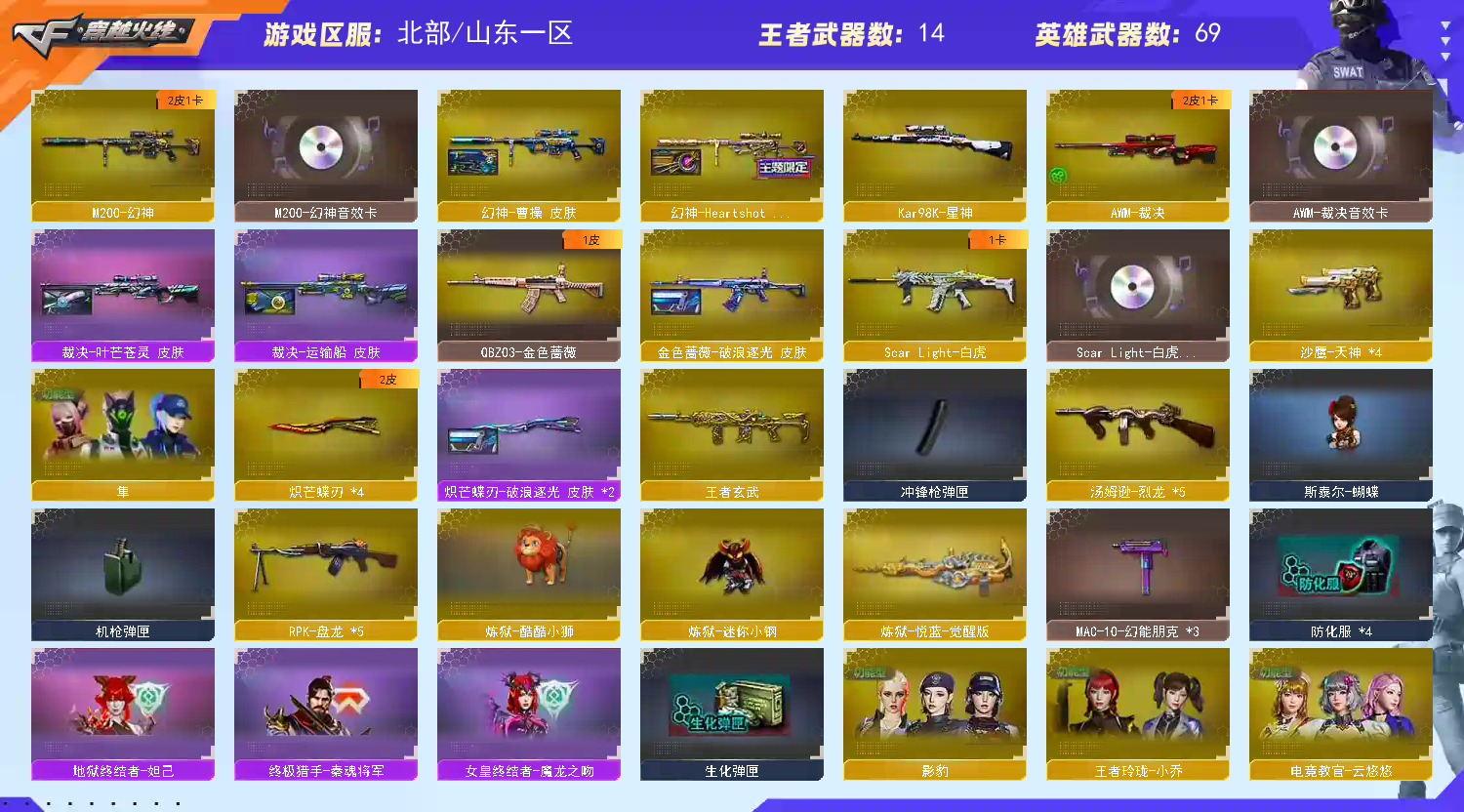 隼 炼狱-酷酷小狮 六盘六烈 斯太尔蝴蝶 炽芒蝶刃*4 4把蝴蝶刀 王者玄武 幻神带卡 裁决带卡;炽芒蝶刃,隼,电竞教官-云悠悠,RPK-盘龙,QBZ03-金色蔷薇,M200-幻神,Scar Light-白虎,