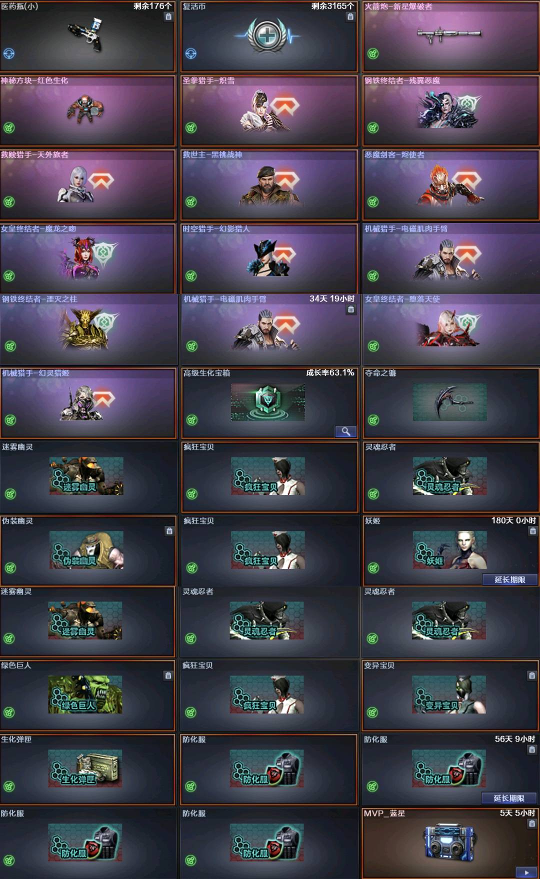 时间快到请不要在开排位打不完了,退出排位不打完拉黑处理谢谢合作!有默认+A背包+B背包均有手雷包可切换不同背包方便快捷 usp冥王2把 usp雷暴2把 cop雷霆1把 量子之心1把 炽芒蝶刃3把 四属性传说艾丽莎 四属性传说神威莲华 四属性鹰(加副武器子弹一发)幻神 QBZ 白虎 玲珑I级 泡泡象 狮子 等⭐ 音效卡:裁决+黑骑士+极光+白虎+毁灭+雷神+朱雀+碧霄极光+炼狱-百战金芒+白虎-盛典舞曲+朱雀-电竞之星+屠龙-电竞之星+AN94-竞魂超新星⭐ 生化皮肤:机械猎手-幻灵猎姬+圣泉猎手-炽雪+时空猎手-幻影猎人+恶魔剑客-烬使者+救世主黑桃战神+救赎猎手-天外旅者+2皮女皇-恶魔之吻-堕落天使+2皮钢铁湮灭之柱-残翼恶魔+神秘方块-红色生化+钩子+伪装幽灵+小矮子+变异宝贝+疯狂宝贝+绿巨人⭐ 弹匣:vip6+狙击+手枪+冲锋枪+机枪+生化+散弹+挑战⭐ 冲锋枪:2蝴蝶+异变清道夫+6烈+毒蜂+a180等⭐ 机枪:泡泡象+狮子+3炼狱(百战金芒-炼狱音效卡+星空皮肤)+6盘龙等⭐ 挑战:9阶+甄选套+擎天柱+3黑骑士+王者之势+白虎+电玩白虎等⭐;USP-雷暴,炽芒蝶刃,传说艾莉莎,RPK-盘龙,QBZ03-金色蔷薇,炼狱-泡泡象,M200-幻神,