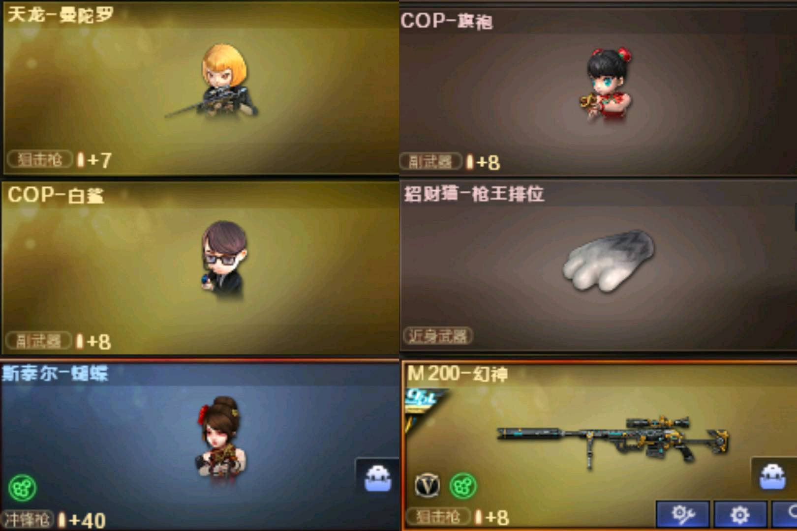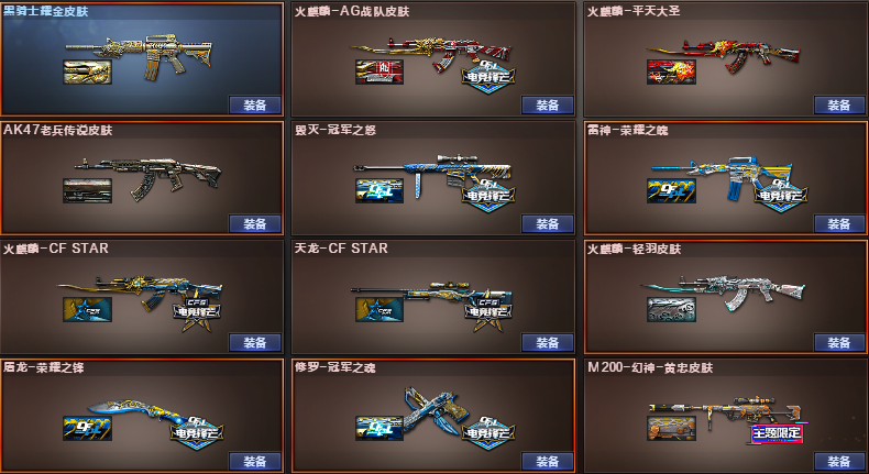 11111;USP-雷暴,荣耀世冠-柯尔特,电竞教官-云悠悠,RPK-盘龙,QBZ03-金色蔷薇,M200-幻神,