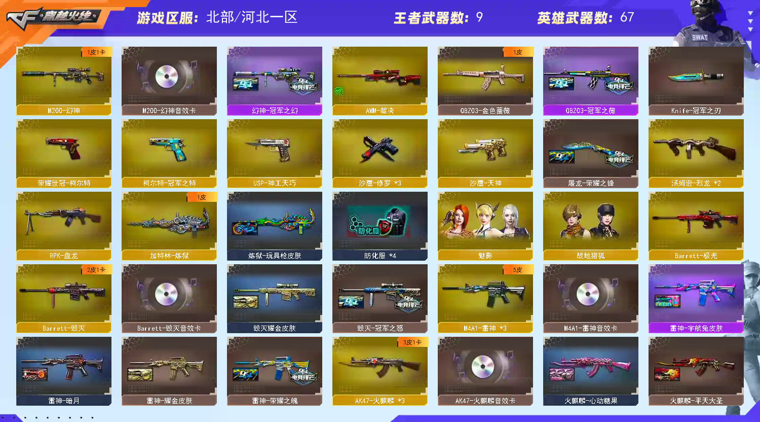 ◆◆北部冠军之幻+音效 冠军之薇冠军之刃特 神工天巧USP 荣耀世冠柯尔特 荣耀之魄 王者之心 王者之击 王者之武 王者之影 王者之怒 王者之力 职业经理 雷神宇航兔皮肤 耀金 荣耀之魄 白鲨冠军 毁灭耀金 冠军之怒 金色蔷薇冠军之薇 黑骑士冠军之势 荣耀世冠柯尔特 动感闪耀套 斩神刀雷暴 千变 火麒麟 千变 火麒麟 雷神 毁灭 裁决 龙血 朱雀 白虎电玩蓝兔 金色蔷薇 天龙 烈火 海王 极光 盘龙 烈龙 炼狱 超新星 黑骑士;荣耀世冠-柯尔特,柯尔特-冠军之特,Knife-冠军之刃,RPK-盘龙,QBZ03-金色蔷薇,M200-幻神,