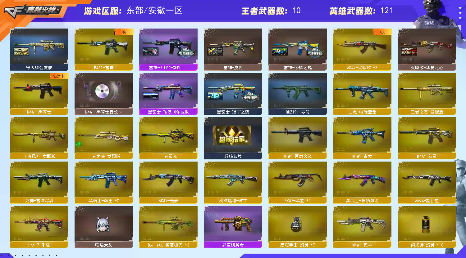 幻神星火3皮+星神3皮+裁决叶芒苍灵5皮带卡.柯尔特百战金芒8副手.隼+双炽芒蝶刃+双清道夫+双枪娘
