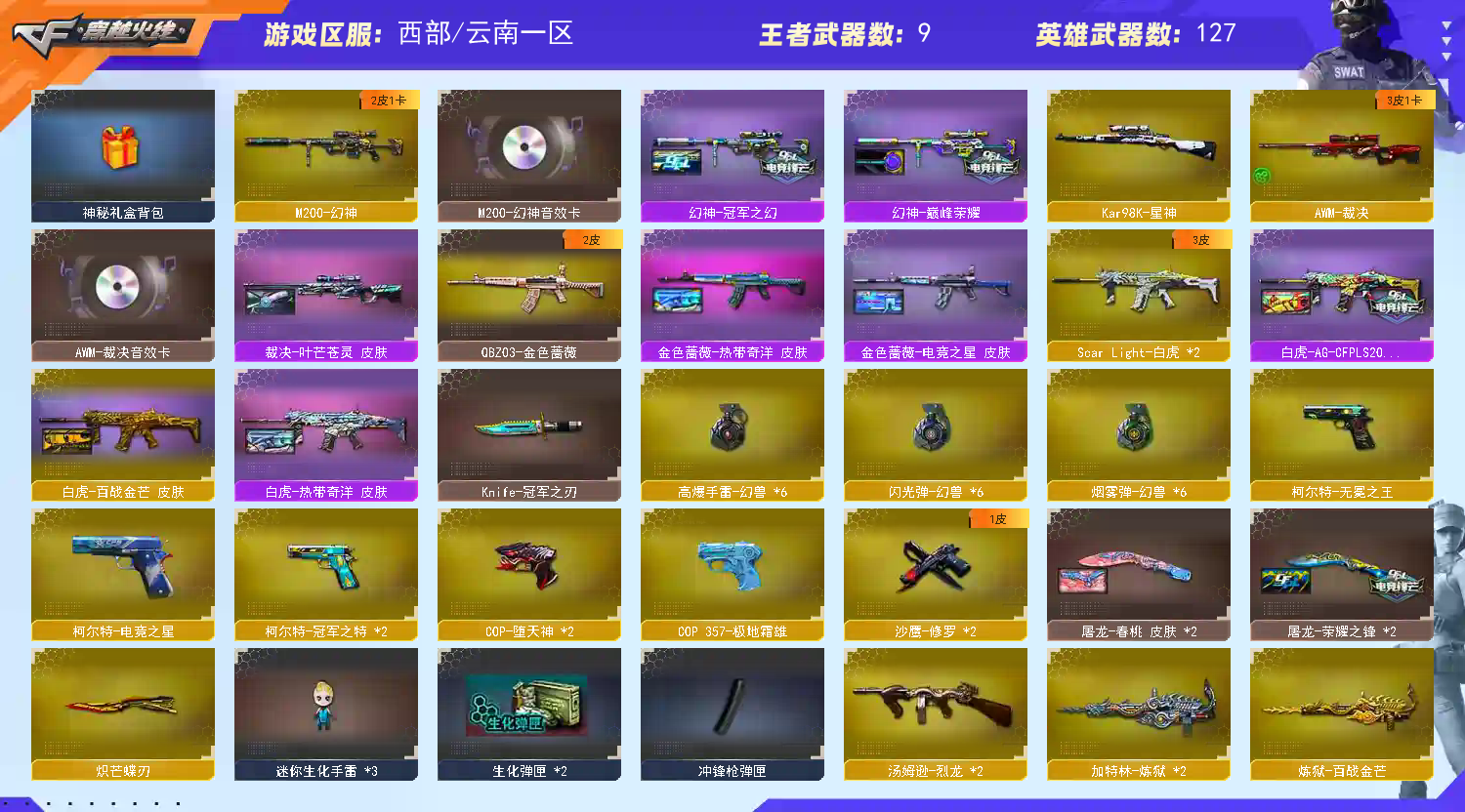好好玩呗!别开!都去开封号了别人玩啥!求放过!不要退排位哦!退排位禁赛了,别人怎么玩!谢谢!不要退排位!时间不够了了就加时!网费不够了就下机!;柯尔特-无冕之王,柯尔特-冠军之特,炽芒蝶刃,Knife-冠军之刃,QBZ03-金色蔷薇,M200-幻神,Scar Light-白虎,