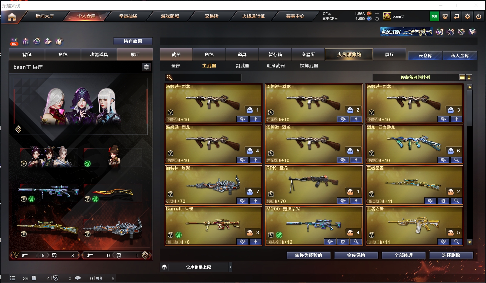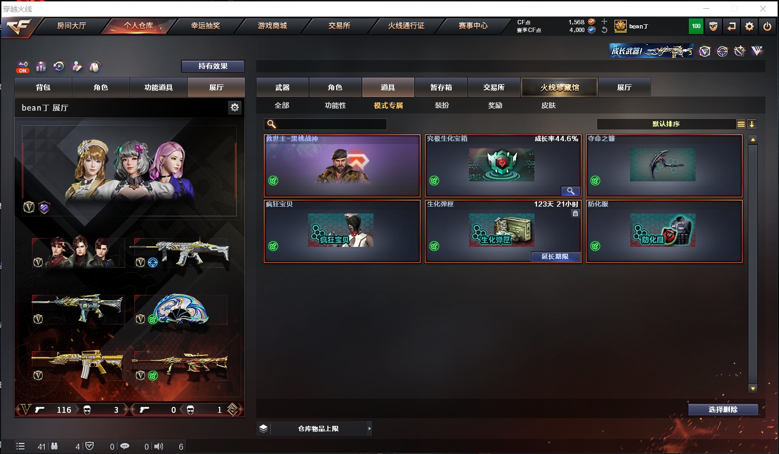 角色:四防传说影煞 4防电竞教官 雨司 华 武器:六烈龙,斯泰尔-蝴蝶,RPK盘龙1把,加特林-炼狱,竞技荣光套,炽芒蝶刃,迷你生化手雷,MAC-10-途鸦*2,轻型军用手斧-镜。QBZ03-金色蔷薇 ,王者星霆 道具:生化弹夹 机枪弹夹 冲峰枪弹夹 夺命之镰 变异宝贝 疯狂宝贝 防化服 烟雾保护头盔 闪光护目镜 防弹衣 防弹头盔;USP-雷暴,炽芒蝶刃,传说影煞,电竞教官-云悠悠,RPK-盘龙,QBZ03-金色蔷薇,Scar Light-白虎,