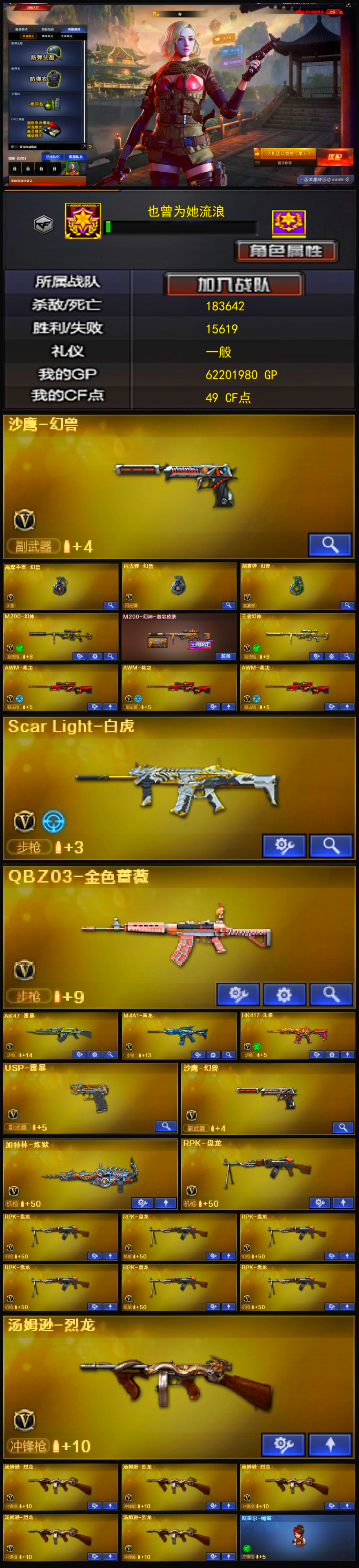可排位120V/M200-幻神+黄忠/幻兽套+6烈6盘+雷暴蝴蝶+白虎QBZ蔷薇爆破生化全装;USP-雷暴,RPK-盘龙,QBZ03-金色蔷薇,M200-幻神,Scar Light-白虎,