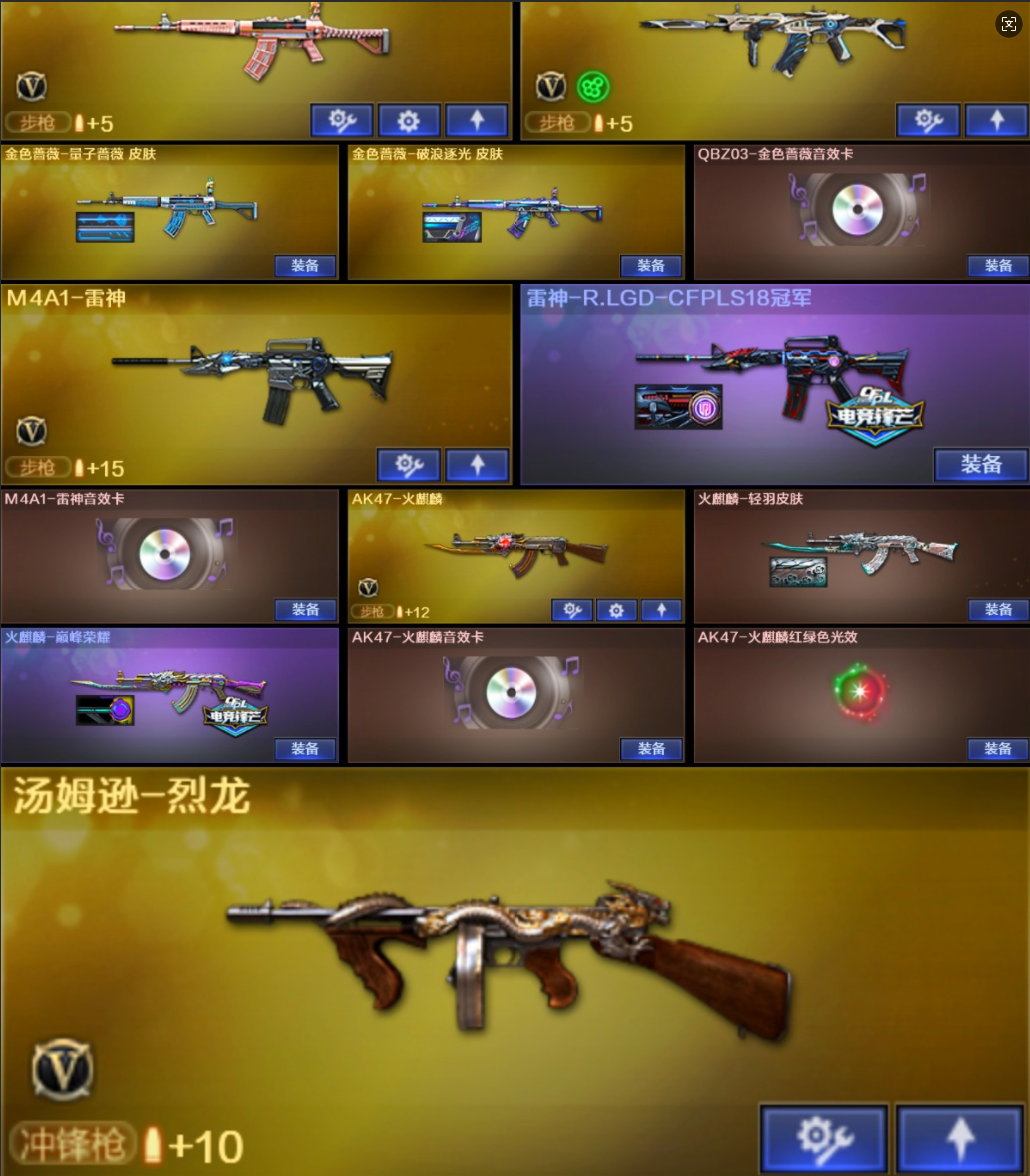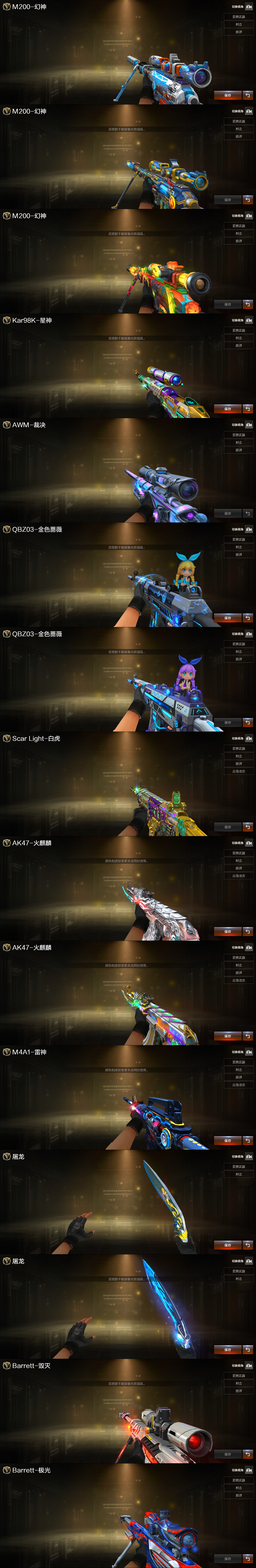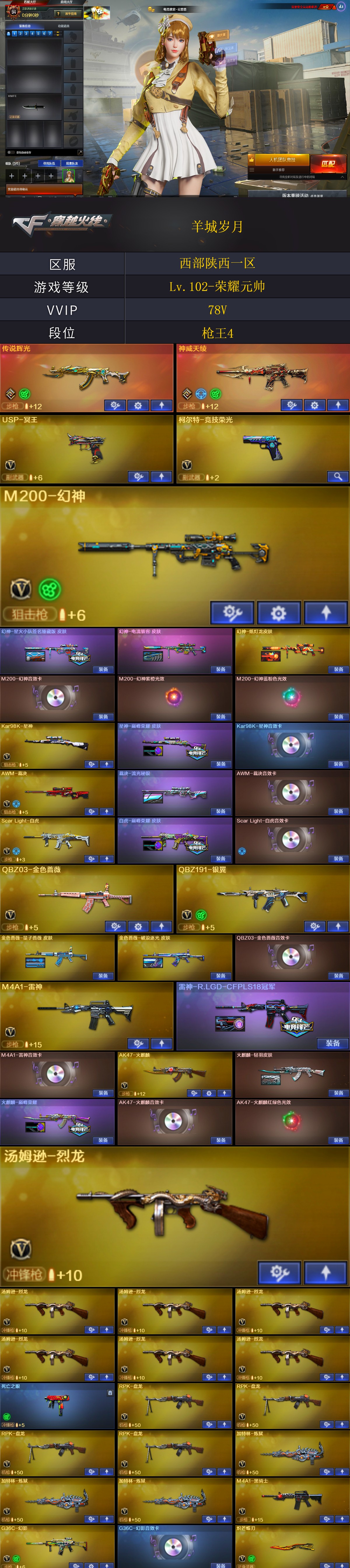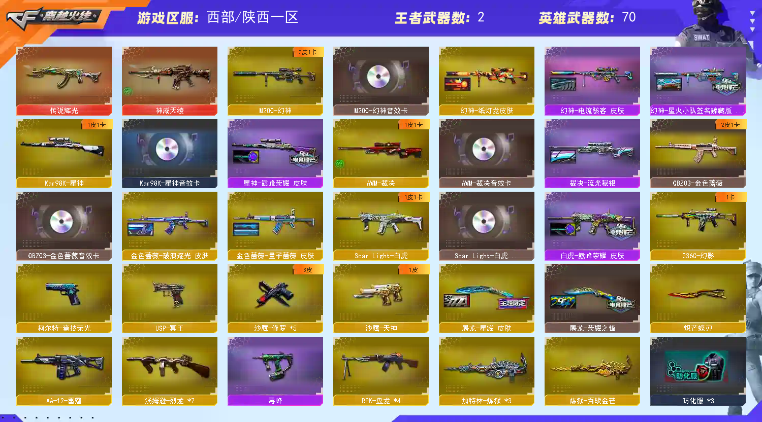 【稀有武器】:传说辉光/M200-幻神/Kar98K-星神/G36C-幻影/柯尔特-竞技荣光/修罗-古蛇迷踪/QBZ03-金色蔷薇/白虎/炽芒蝶刃/AK47-火麒麟/M4A1-黑龙/M4A1-雷神/M4A1-黑骑士/AK47-无影/Barrett-毁灭/Barrett-极光/AWM-裁决/M200-竞技荣光/汤姆逊-烈龙(6)/AA-12-雷霆/擎天-竞技荣光 【王者武器】:王者风势-觉醒版 【热门角色】:电竞教官-云悠悠/关小雨/星际战将/研/蛇隐宗/王者-魅影/流浪蔷薇/海豹突击队/潘多拉 【热门音效卡】:M200-幻神音效卡/Kar98K-星神音效卡/AWM-裁决音效卡/QBZ03-金色蔷薇音效卡/M4A1-雷神音效卡/Barrett-毁灭音效卡/M4A1-黑骑士音效卡/AK47-火麒麟音效卡 【热门皮肤】:幻神-星火小队签名臻藏版皮肤/幻神-电流骇客皮肤/幻神-纸灯龙皮肤/屠龙-星耀皮肤/毁灭-星耀皮肤/金色蔷薇-量子蔷薇皮肤/雷神-R.LGD-CFPLS18冠军/星神-巅峰荣耀 皮肤/火麒麟-巅峰荣耀/裁决-流光秘银 【其他亮点】:VEPR-12-金魔/贝雷塔687-射手座;炽芒蝶刃,电竞教官-云悠悠,RPK-盘龙,QBZ03-金色蔷薇,G36C-幻影,M200-幻神,Scar Light-白虎,