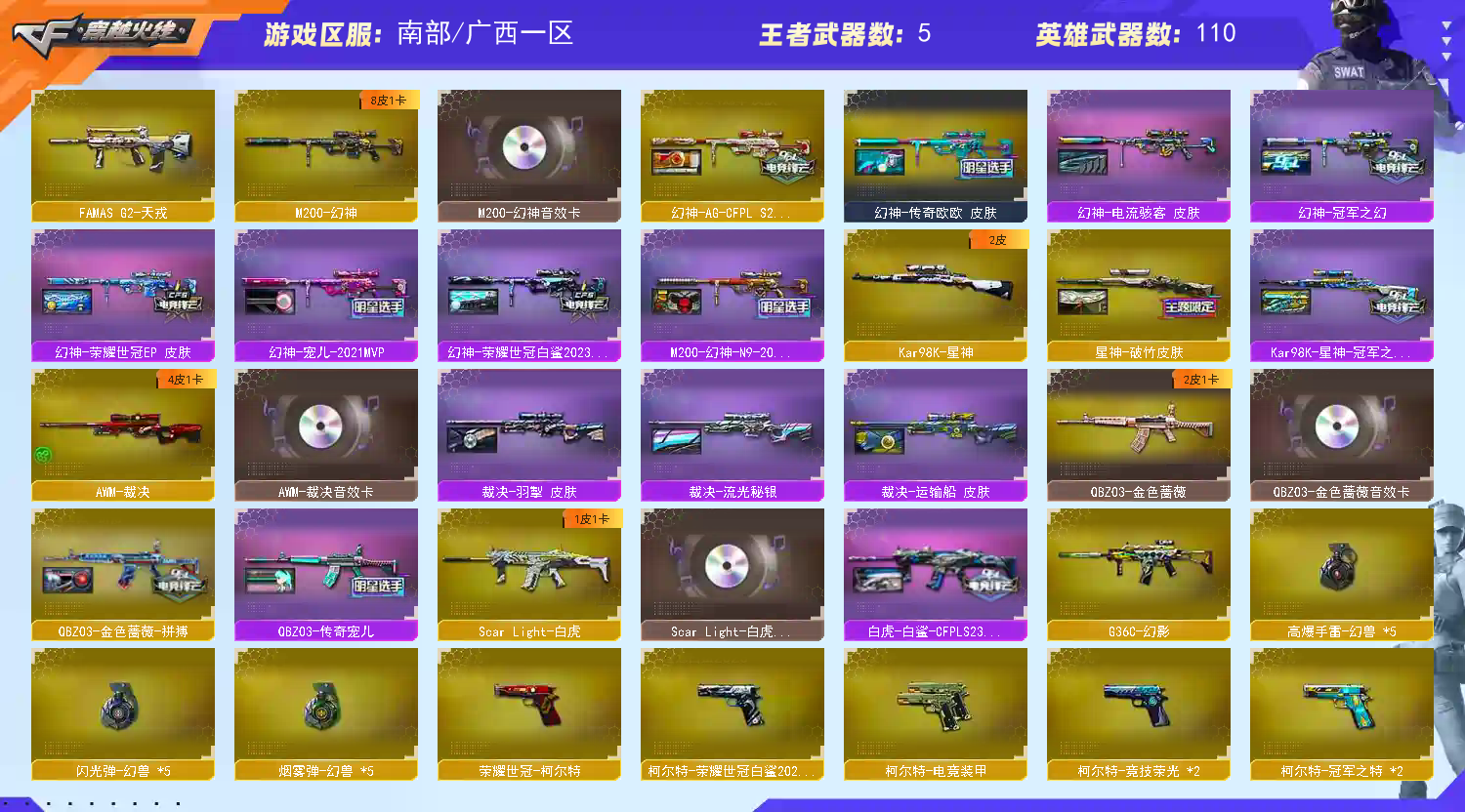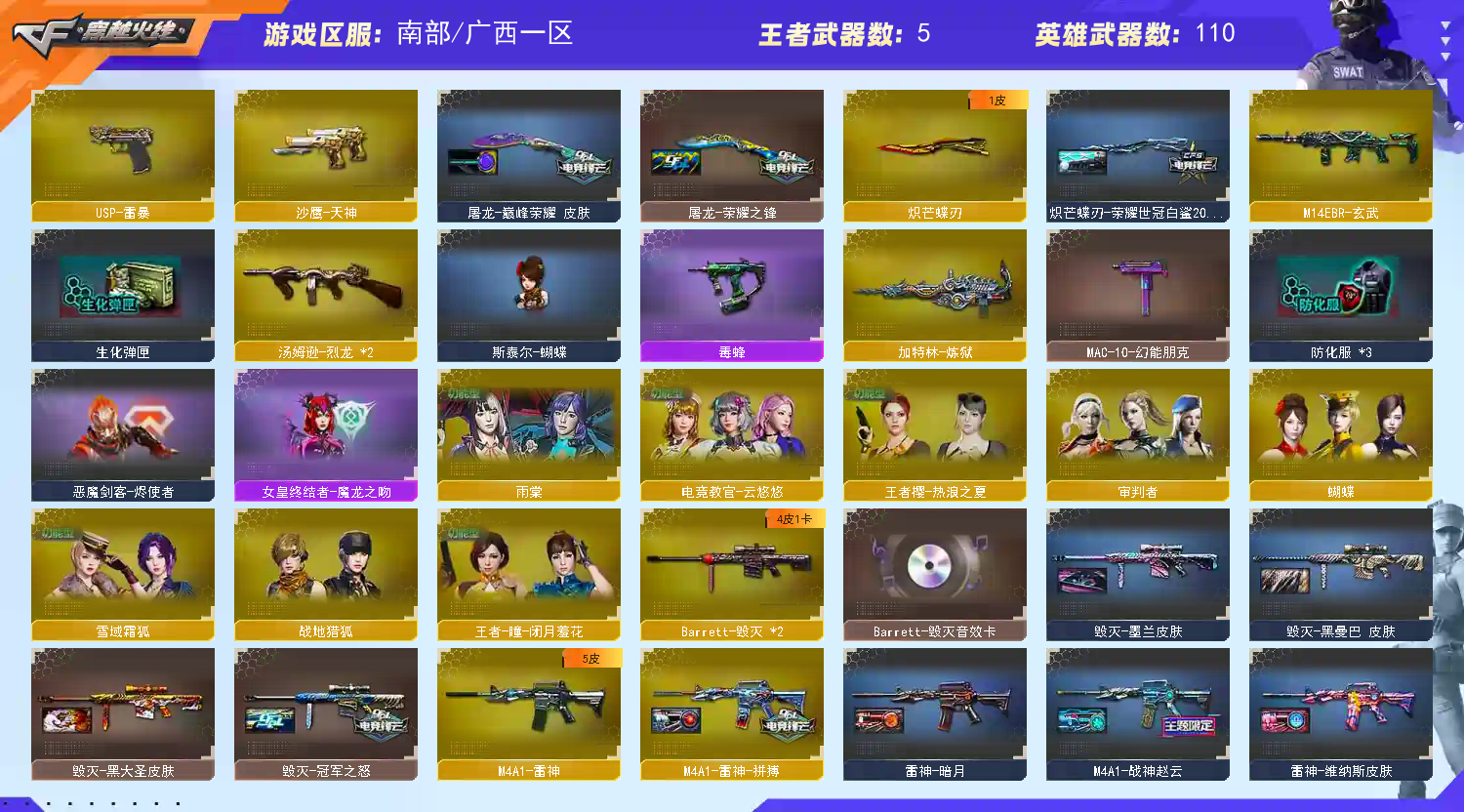 上不去游戏请重试几次(密码不可能错误),游戏里喜欢乱删号主好友的租客永久拉黑!!随意退出排位导致禁赛的将被永久拉黑并联系平台处罚!另外还请各位老板们在快要到时间的时候不要在开一把排位了,这样也会导致禁赛的,谢谢啦!感谢老板们的支持与理解!祝各位老板们玩得开心!! 最后请科技哥高抬贵手!由于账号价值过高,本公司为线下实体公司 出现开挂毁号必追究其法律责任。请文明租用,如若使用科技或鼠标宏等特殊外设导致账号出现问题必追究法律责任! 南部-幻兽天花板-幻神EP皮肤+11质量手枪+裁决三件套+拼搏皮肤/等广西一区118V-bi名片 【幻神8皮2卡:EP战队皮肤+AGS24皮肤+传奇欧欧+世冠白鲨+宠儿+N9+骇客+冠军之幻】 5幻兽+法玛斯天戎+G36C幻影+玄武+幻神 星神 白虎+QBZ+裁决+USP雷暴+荣光柯尔特X2+冠军之特X2+世冠白鲨柯尔特+荣耀世冠柯尔特+蝴蝶刀带白鲨皮+毒蜂+斯太尔蝴蝶+黄金猫猫手套 【星神冠军之星皮肤+裁决4皮带卡+荣耀之魄等】 天花板级别;USP-雷暴,荣耀世冠-柯尔特,柯尔特-荣耀世冠白鲨2023,柯尔特-冠军之特,炽芒蝶刃,电竞教官-云悠悠,QBZ03-金色蔷薇,