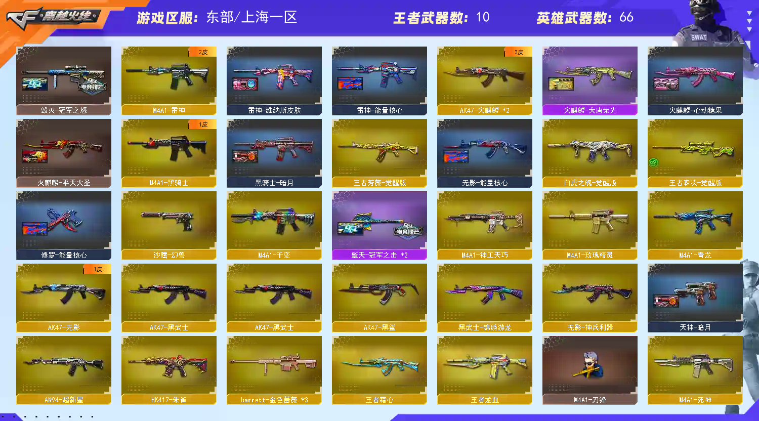 【主武器】M200-幻神/传说夜影/王者芳薇/白虎之魄觉醒/朱雀/玄武/青龙/M4神功天巧/王者炎心/斯太尔蝴蝶/异变清道夫/③炼狱/炼狱悦蓝觉醒/⑥烈龙⑥盘龙/KAC狂怒咆哮/死亡之眼庆典CFS2021/千变/2火麒麟/雷神/黑骑士/无影/死神/黑武士/超新星/黑鲨/黑武士/玫瑰精灵/猎神/蔷薇qbz/王者炎心/王者之势觉醒/天龙/②毁灭/③蔷薇大炮/王者森决觉醒/王者龙血/王者之光/炫金毁灭/炼狱小刚/黑龙吞噬者/双面神/雷神精英刀锋/MK5ss秘银 【副武器】泡泡象COP357/USP-神功天巧/COP-白鲨/④修罗/②天神/沙鹰幻兽/ 【近身武器】迷你泡泡象/②屠龙/龙啸/擎天/麒麟刺/女皇利刃幻兽/剧毒匕首毒蝰/双股剑秦魂/迷你深渊冰龙/手斧镜 【投掷武器】⑦迷你生化手雷/2高爆神功天巧+2烟/高爆幻兽+烟闪/ 【角色】隼+四防/晴雅+四防/王者潘多拉+四防/葵/对讲机/炫彩背包/圣灵戒/魔龙戒 【皮肤】幻神-荣耀世冠白鲨皮肤/蔷薇qbz-荣耀世冠白鲨皮肤/毁灭-冠军之怒皮肤/擎天-②冠军之击皮肤/火麒麟-大唐荣光皮肤/ 【音效卡】②白虎音效卡 【道具】紫金大元首/全背包/VIP6/变异宝贝/变异宝贝/全弹夹/机械猎手幻灵猎姬皮肤/终极猎手荒漠刀客皮肤/时空猎手幻影猎人皮肤/虚空终结者暗域熔岩皮肤/生化爆破全装 禁止外挂,文明游戏,谢谢合作!(疫情已经够难了,切莫作怪) 谢谢老板,谢谢大哥,感激不尽,祝老板好运一生;隼,晴雅,RPK-盘龙,QBZ03-金色蔷薇,M200-幻神,