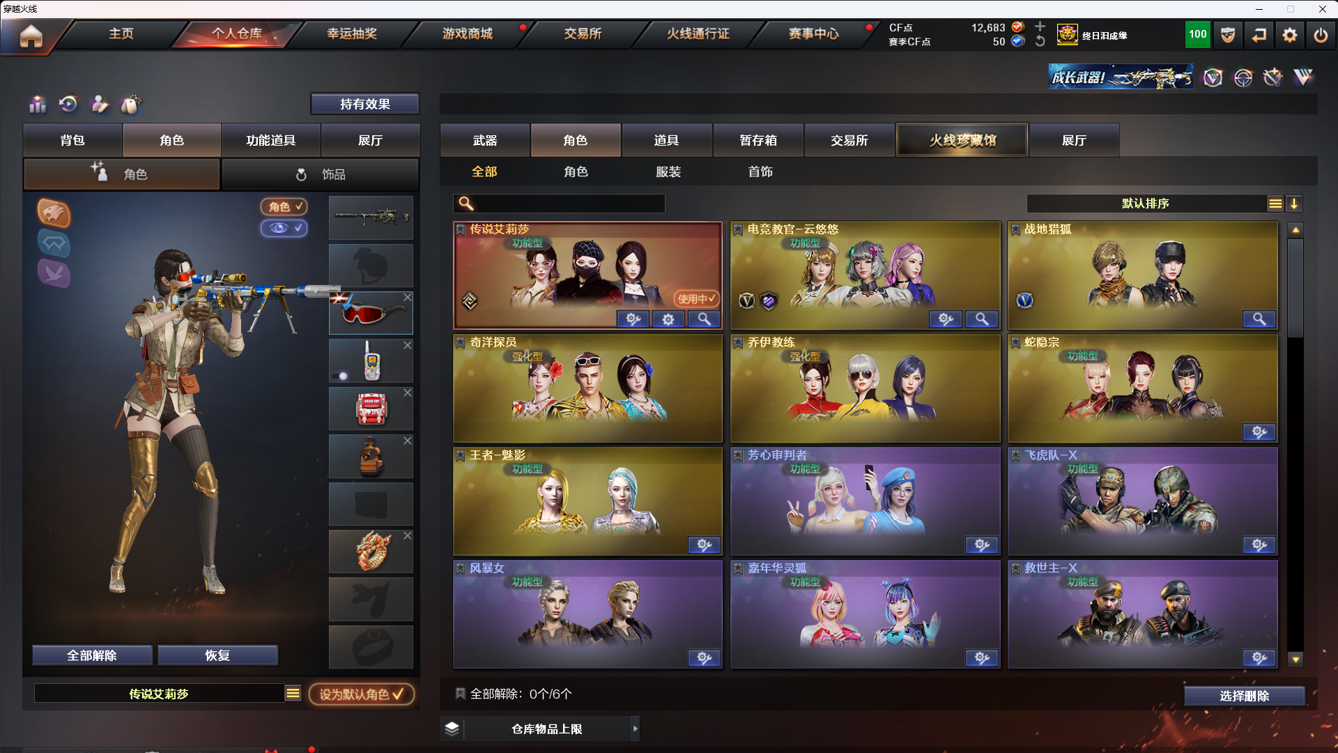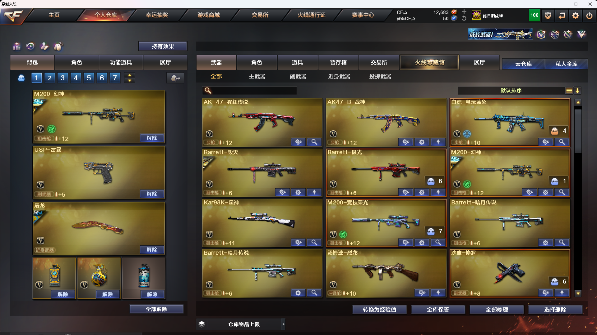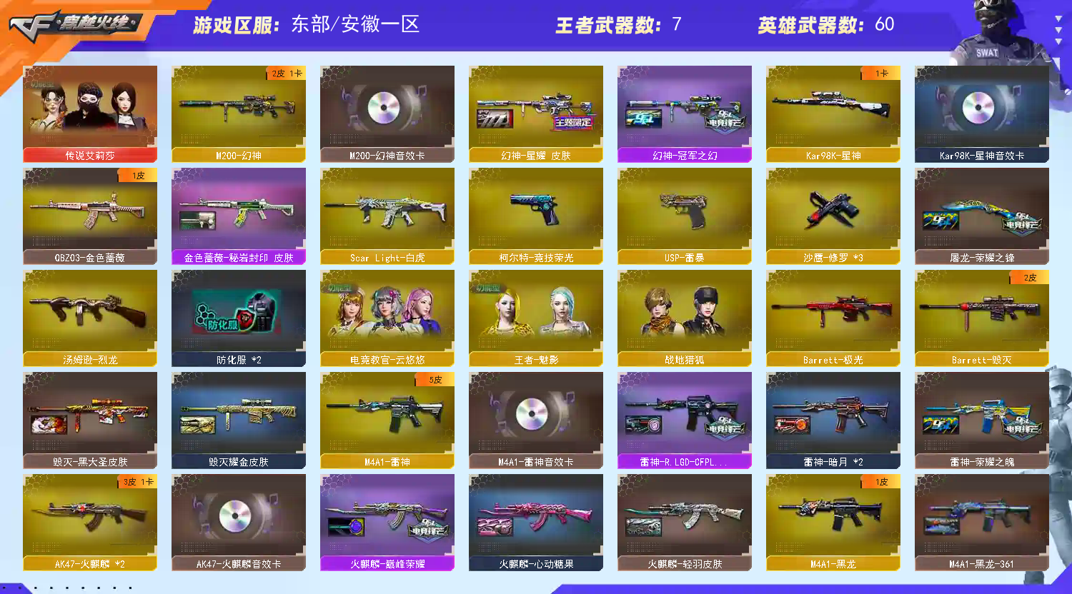 传说艾丽莎/幻神音效卡/幻神冠军之幻/幻神星耀/星神音效卡/竞技悠悠套雷暴白虎蔷薇雷神荣耀之魄;USP-雷暴,电竞教官-云悠悠,传说艾莉莎,QBZ03-金色蔷薇,M200-幻神,Scar Light-白虎,Kar98K-星神,