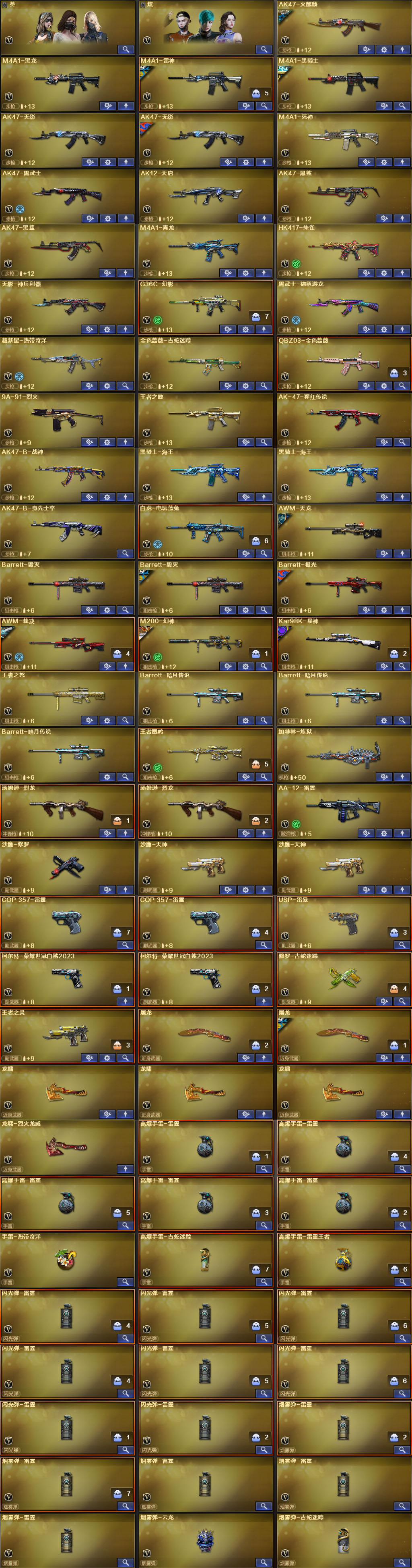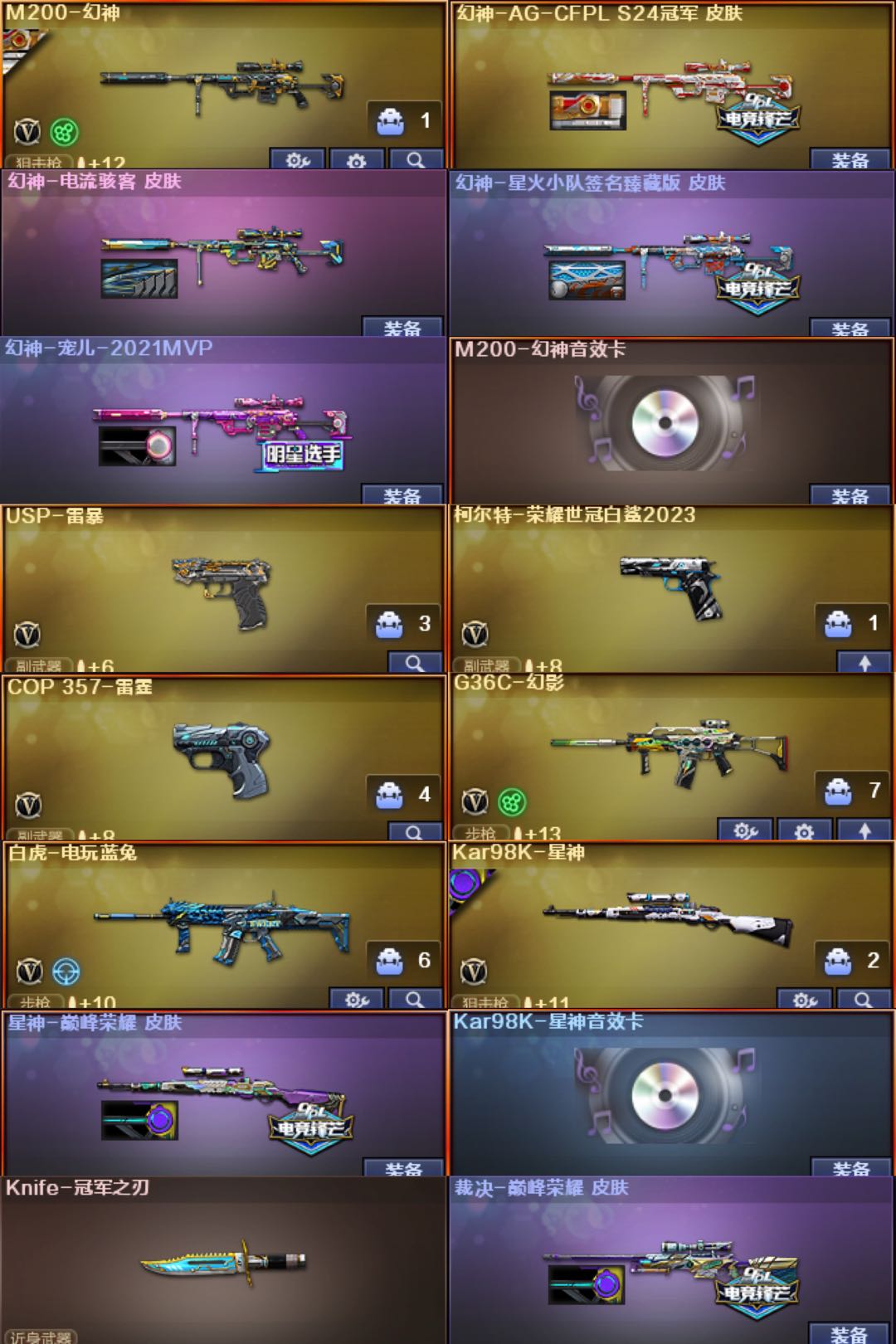 喜欢点点收藏;USP-雷暴,柯尔特-荣耀世冠白鲨2023,Knife-冠军之刃,QBZ03-金色蔷薇,G36C-幻影,M200-幻神,Kar98K-星神,