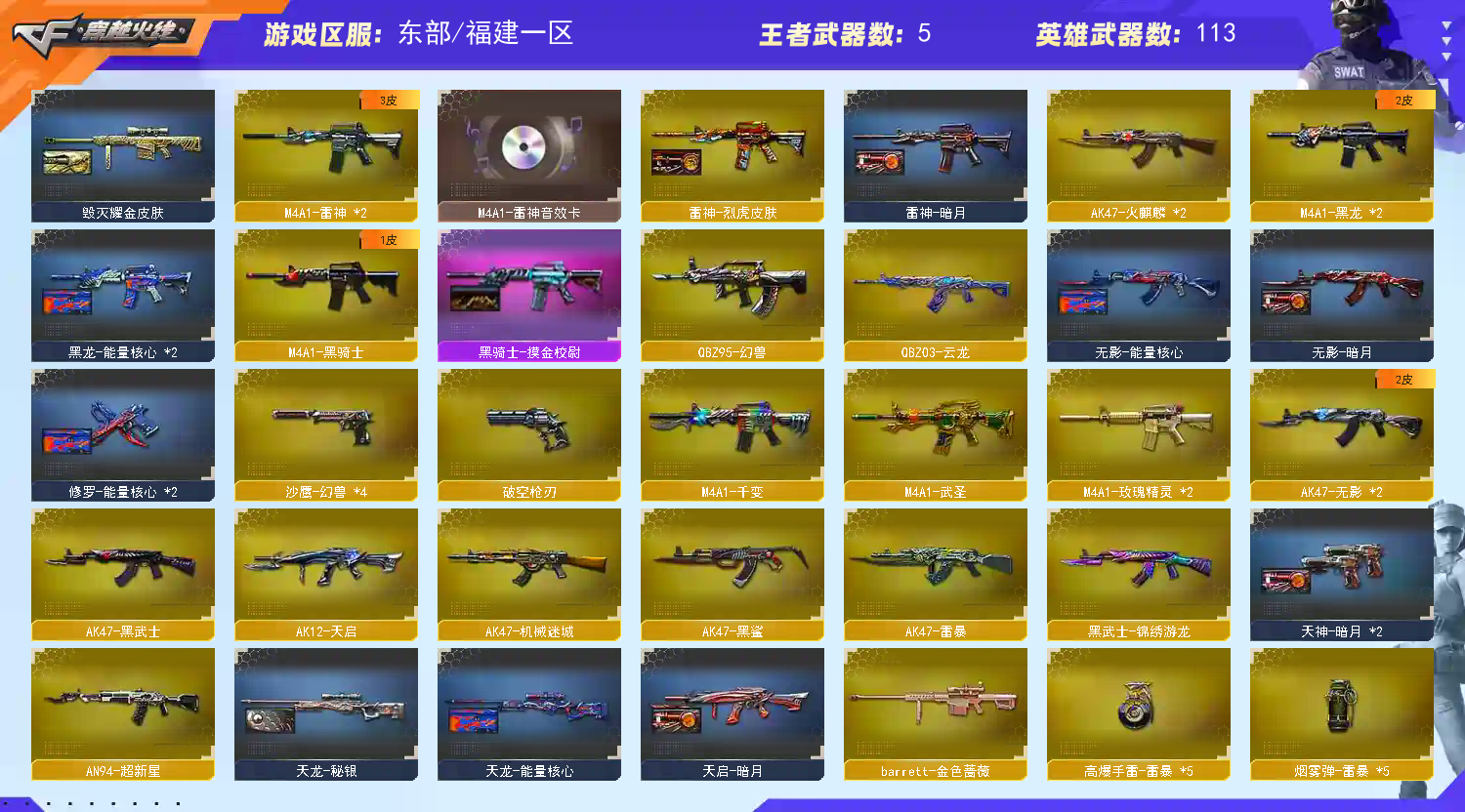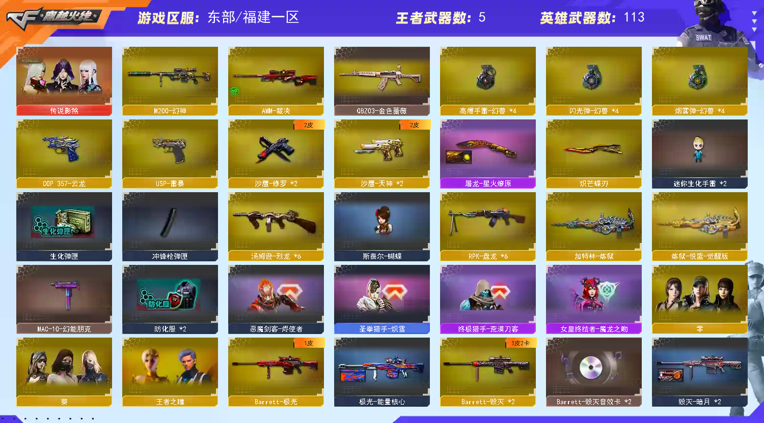 M200-幻神 Barrett毁灭、极光、金色蔷薇,灵.QBZ03金色蔷薇嘉年华,盘龙7把 烈龙7把 9A91-烈火 AK47火麒麟、雷暴、机械迷城、无影、黑鲨,AK12天启,AN94超新星,AWM天龙、裁决,M4A1武圣、死神、玫瑰精灵、雷神、黑骑士、黑龙、QBZ95幻兽,加特林炼狱, 刀:炽芒蝶刃,女皇利刃-幻兽,屠龙,擎天,斩神刀雷暴,麒麟刺,龙啸,;USP-雷暴,炽芒蝶刃,传说影煞,RPK-盘龙,QBZ03-金色蔷薇,M200-幻神,