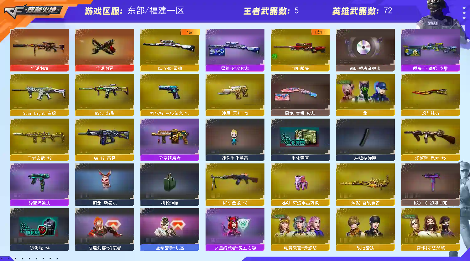 东部战区 包括福建一区、浙江一区、教育大区、安徽一区、上海一区、浙江二区、江苏一区、移动专区、上海二区、江苏二区。;传说幽冥,炽芒蝶刃,隼,电竞教官-云悠悠,RPK-盘龙,传说幽瞳,G36C-幻影,