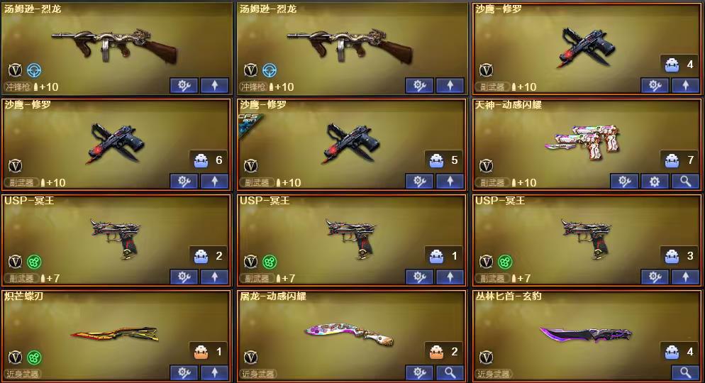 4传说✅荆棘+炼狱紫泡泡象+蝴蝶刀✅6烈蝴蝶+清道夫小人枪✅传说星骇+圣谕+夜影+艾莉莎✅冥王x3
