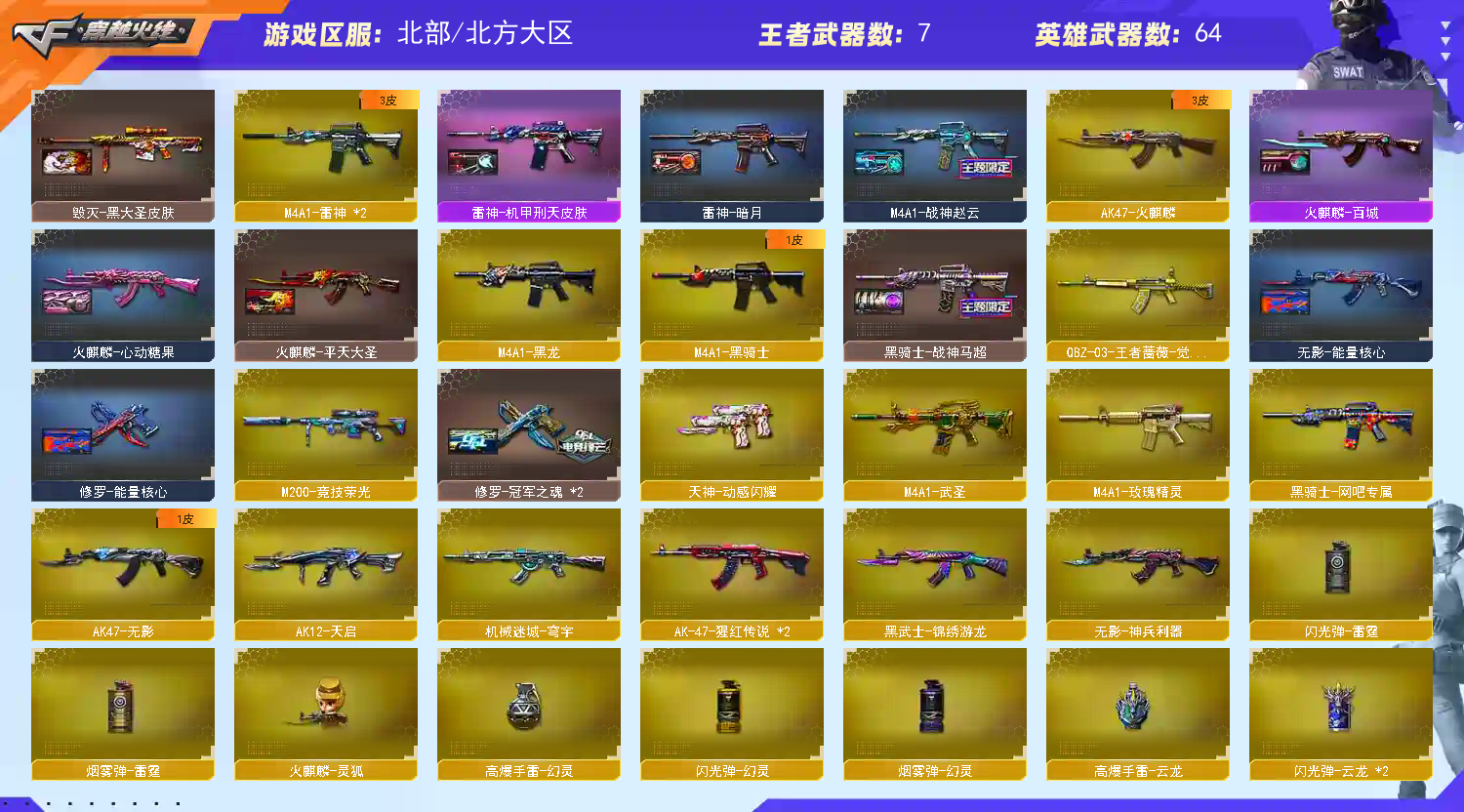 爆破性价比✅幻神3皮+星神漫游+炽芒蝶刃世冠白鲨+USP雷暴+四防云悠悠|竞技荣光全套+裁决音效卡 毁灭音效卡,qbz音效卡,白虎皮肤, 稀有武器:传说圣域、M200幻神、98K星神、M200竞技荣光、USP雷暴、柯尔特竞技荣光、炽芒蝶刃、云龙扇、白虎、QBZ金色蔷薇、火麒麟、黑龙、雷神X2、黑骑士、无影、天启、武圣、无影神兵利器、黑武士锦绣游龙、玫瑰精灵、天龙、毁灭、极光、裁决、Barrett朱雀、烈龙、修罗、天神、天神动感闪耀、屠龙、擎天、麒麟刺、擎天竞技荣光X3、龙啸烈火龙威 稀有角色:电竞教官云悠悠(四防:减少闪光效果+免疫队友炸弹伤害+减少掉落伤害+副武器自动装弹)、葵、瞳、乔伊教练、王者瞳闭月羞花、王者影豹(四防:防弹头盔+免疫队友炸弹伤害+减少掉落伤害+狙击枪自动装弹)、职业悬殊、影武者X、斯沃特X 音效卡:QBZ金色蔷薇音效卡、极光音效卡、毁灭音效卡、裁决音效卡、绝迹语音包 稀有皮肤:幻神荣耀世冠白鲨2023皮肤/星耀皮肤/电流骇客皮肤、星神漫游皮肤、炽芒蝶刃荣耀世冠白鲨2023皮肤、白虎霓虹机甲皮肤、毁灭星耀皮肤/平天大圣皮肤/航天科技皮肤/星空皮肤/CFS2018皮肤、雷神机甲刑天皮肤/暗月皮肤/战神赵云皮肤、火麒麟百城皮肤/CFSTAR皮肤/心动糖果皮肤/平天大圣皮肤、无影能量核心皮肤、修罗冠军之魂皮肤X2/能量核心皮肤、天龙CFSTAR皮肤、屠龙荣耀之峰皮肤 王者炫金武器:QBZ王者蔷薇、王者冰峰、王者之幻、炫金骑士、炫金毁灭、炫金修罗 投掷套装:幻灵套、竞技荣光套、云龙套、雷霆套 小人枪武器特殊武器:火麒麟灵狐、雷神小红、迷你救赎猎手、加特林机械猎手、牛牛AK、M37葵、AK12夜玫瑰;USP-雷暴,炽芒蝶刃,电竞教官-云悠悠,QBZ03-金色蔷薇,M200-幻神,Scar Light-白虎,Kar98K-星神,