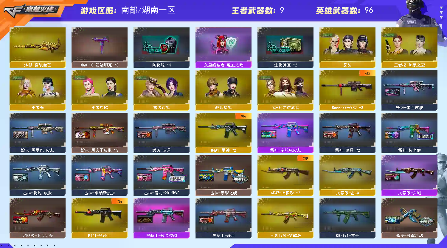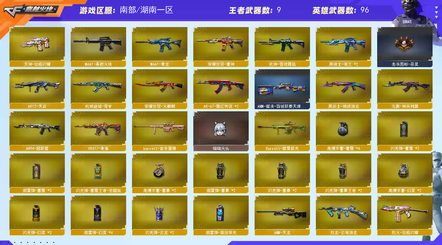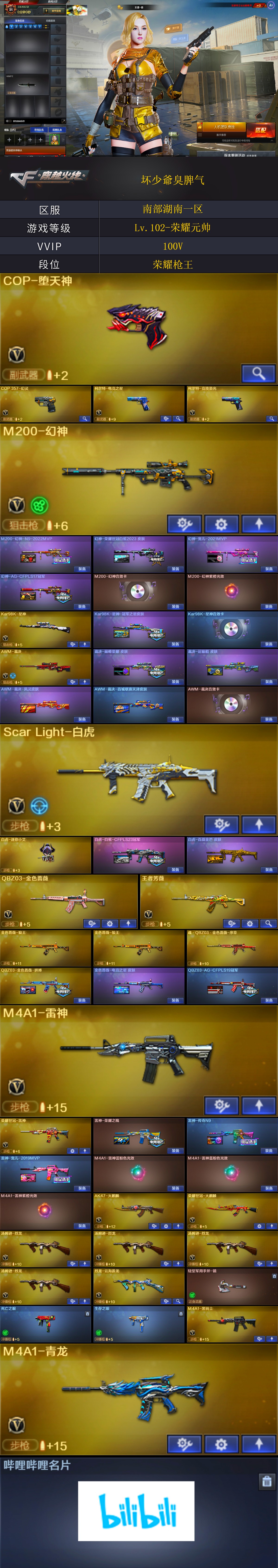 【稀有武器】:M200-幻神/Kar98K-星神/ScarLight-白虎/M4A1-青龙/COP357-幻灵/柯尔特-竞技荣光/天神-动感闪耀/修罗-古蛇迷踪/金色蔷薇-古蛇迷踪/QBZ03-金色蔷薇/AK47-火麒麟(2)/M4A1-雷神(2)/M4A1-黑骑士/荣耀世冠-火麒麟/荣耀世冠-雷神/Barrett-毁灭/AWM-裁决/汤姆逊-烈龙(4)/AA-12-雷霆/斩神刀-雷暴/幻灵之锋 【王者武器】: 【热门角色】:影豹/奇洋探员/乔伊教练/蛇隐宗/王者春/王者涂鸦/灵狐者-职业经理/潘多拉-X/兔囡囡/潘多拉 【热门音效卡】:M200-幻神音效卡/Kar98K-星神音效卡/AWM-裁决音效卡 【热门皮肤】:M200-幻神-N9-2022MVP/幻神-荣耀世冠白鲨2023皮肤/幻神-宠儿-2021MVP/幻神-AG-CFPLS17冠军/白虎-白鲨-CFPLS23冠军/裁决-巅峰荣耀皮肤/Kar98K-星神-冠军之星皮肤/屠龙-破浪逐光皮肤/QBZ03-AG-CFPLS19冠军/屠龙-巅峰荣耀皮肤/雷神-宠儿-2019MVP/雷神-传奇N9/屠龙-春桃皮肤/雷神-荣耀之魄 【其他亮点】:白虎-迷你小艾/贝雷塔687-射手座(2)/烟雾弹-荣耀世冠白鲨2023/哔哩哔哩名片;QBZ03-金色蔷薇,M200-幻神,Scar Light-白虎,Kar98K-星神,