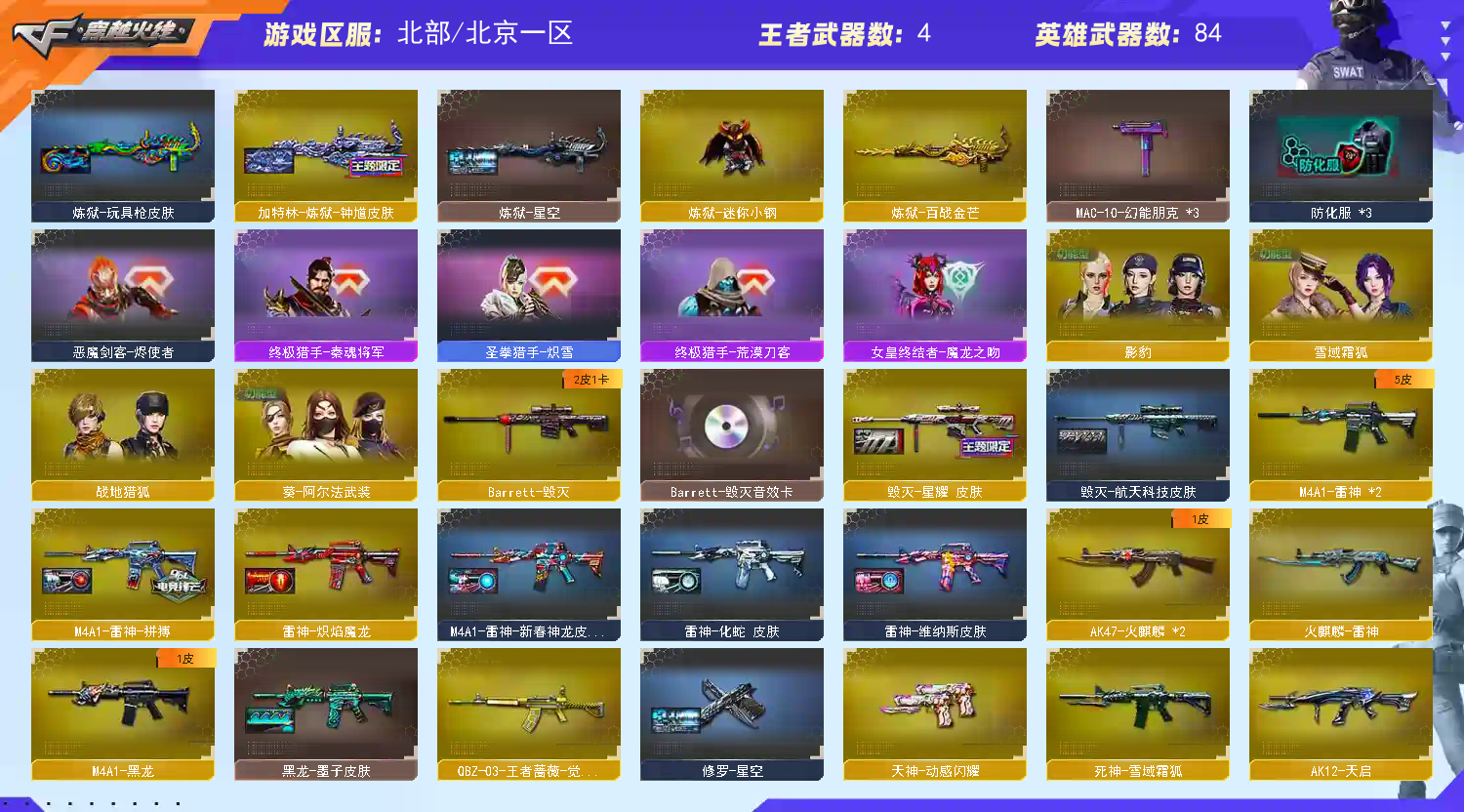 此账号和平台属于合作关系,已经备案。如果账号封号或者什么的,商户将会协助平台然后报警。 收藏好评!由于异地登录保护机制,部分客户在使用客户端自动上号时会出现密码错误,注意本号密码不会错误,请多尝试5-6次!本账号已经过虚拟财产-认1证。请素质租号,文明游戏,谢谢大家配合!!!;柯尔特-荣耀世冠白鲨2023,炽芒蝶刃,传说影煞,隼,RPK-盘龙,QBZ03-金色蔷薇,M200-幻神,