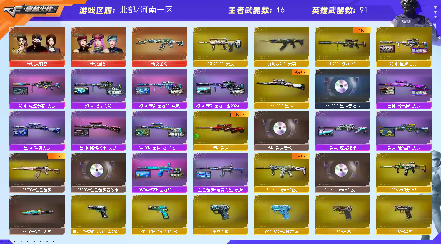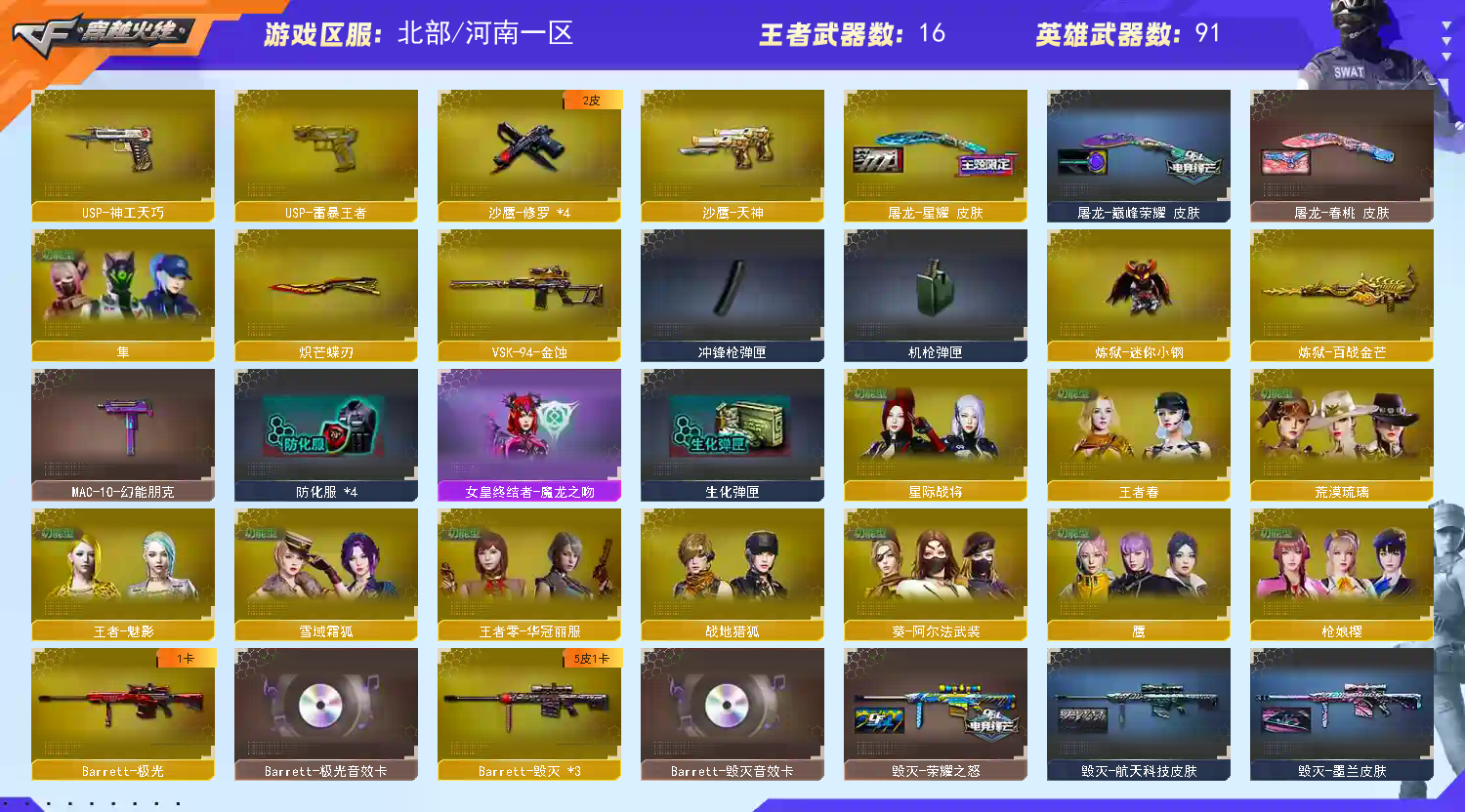 【商品标题】:北部河南一区-103V-可二次实名-【Lv.100.1-大元帅】-【段位:枪王1】 【稀有武器】:M200-幻神(2)/Kar98K-星神/VSK-94-金蚀/G36C-幻影(2)/ScarLight-白虎/M4A1-青龙/HK417-朱雀/雷霆之契/USP-雷暴/USP-神工天巧/天神-动感闪耀/柯尔特-荣耀世冠白鲨2023/柯尔特-冠军之特/QBZ03-金色蔷薇/AK47-火麒麟/M4A1-黑龙/M4A1-雷神(2)/M4A1-黑骑士/AK47-无影/AK47-黑武士/Barrett-毁灭(2)/Barrett-极光/AWM-裁决/炽芒蝶刃/幻灵之锋 【王者武器】:QBZ-03-王者蔷薇-觉醒版/王者芳薇-觉醒版 【热门角色】:传说艾莉莎/荒漠琉璃/枪娘樱/星际战将/鹰/隼/乔伊教练/王者春/王者-魅影/潘多拉-X/兔囡囡/潘多拉 【热门音效卡】:Kar98K-星神音效卡/AWM-裁决音效卡/Scar Light-白虎音效卡/QBZ03-金色蔷薇音效卡/Barrett-毁灭音效卡/M4A1-黑骑士音效卡/Barrett-极光音效卡 【热门皮肤】:幻神-星耀皮肤/幻神-荣耀世冠白鲨2023皮肤/幻神-电流骇客皮肤/屠龙-星耀皮肤/Kar98K-星神-冠军之星皮肤/星神-枪娘默 皮肤/星神-璀璨皮肤/裁决-流光秘银/屠龙-巅峰荣耀皮肤/毁灭-荣耀之怒/屠龙-春桃皮肤/雷神-荣耀之魄 【其他亮点】:炼狱-迷你小钢/白虎-九尾白狐/金色蔷薇-空/幻神-魅影/贝雷塔687-射手座/哔哩哔哩名片 (截图展示段位不代表实际段位,如赛季更新等不可抗拒因素发生变化,其余道具看截图或咨询客服);