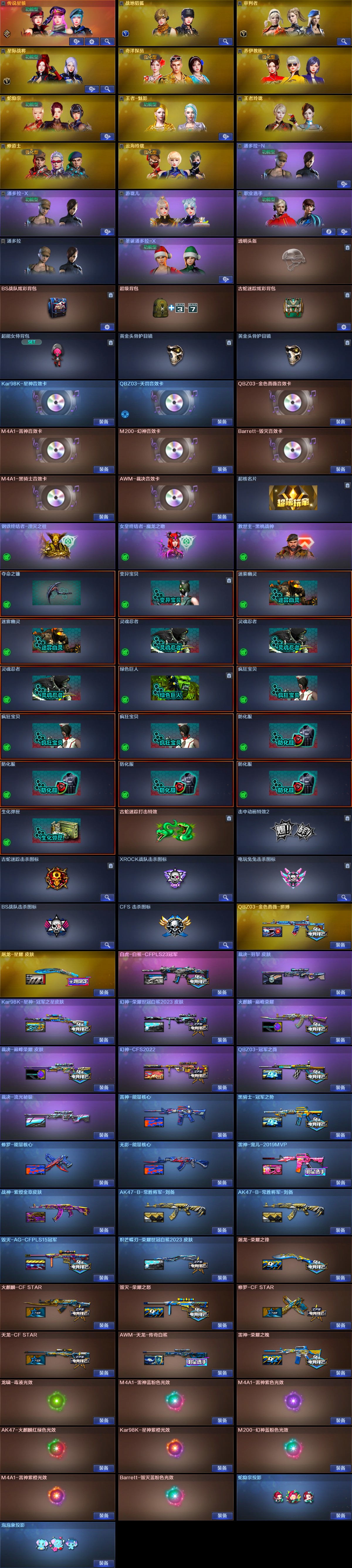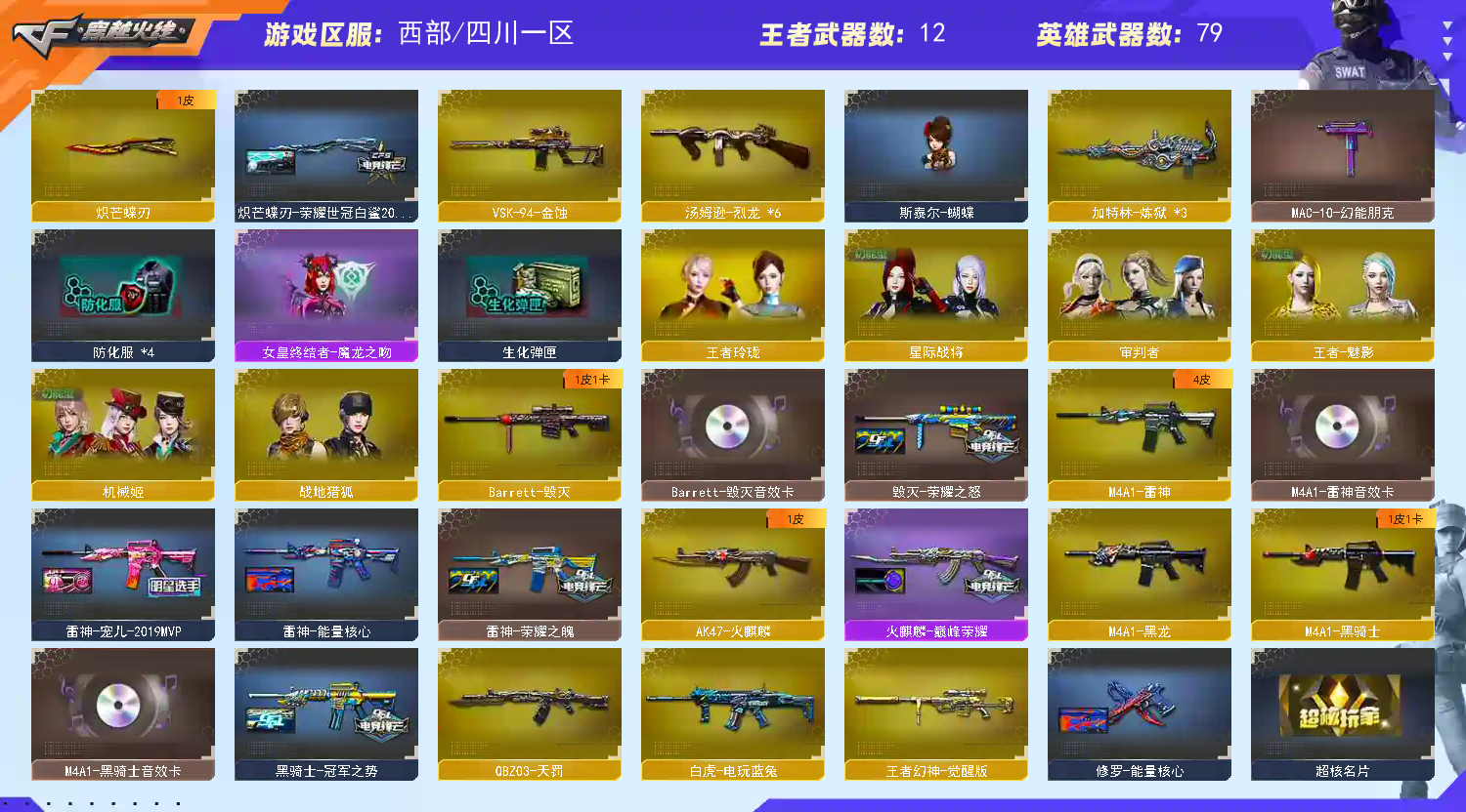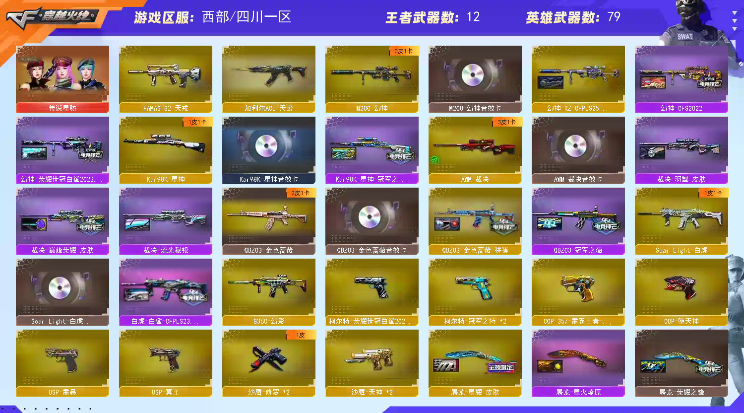 【稀有武器】:M200-幻神/Kar98K-星神/G36C-幻影/ScarLight-白虎/QBZ03-天罚/USP-雷暴/COP-堕天神/柯尔特-荣耀世冠白鲨2023/修罗-古蛇迷踪/COP357-雷霆王者-觉醒版/柯尔特-冠军之特,加利尔天袭 蝴蝶刀带皮(2)/金色蔷薇-古蛇迷踪/QBZ03-金色蔷薇/AK47-火麒麟/M4A1-黑龙/M4A1-雷神/M4A1-黑骑士/白虎-电玩蓝兔/Barrett-毁灭/AWM-裁决/加特林-炼狱(3)/汤姆逊-烈龙(6)/斩神刀-雷暴/马来剑-夜魔 【王者武器】:王者幻神-觉醒版 【热门角色】:星际战将/奇洋探员/乔伊教练/蛇隐宗/王者-魅影/王者玲珑/潘多拉-X/职业选手/潘 已处理问题 多拉 【热门音效卡】:M200-幻神音效卡/Kar98K-星神音效卡/AWM-裁决音效卡/QBZ03-金色蔷薇音效卡/QBZ03-天罚音效卡/M4A1-雷神音效卡/Barrett-毁灭音效卡/M4A1-黑骑士音效卡 【热门皮肤】:幻神-荣耀世冠白鲨2023皮肤/幻神-CFS2022/幻神-kz皮肤/白虎-白鲨-CFPLS23冠军/裁决-巅峰荣耀皮肤/屠龙-星耀皮肤/裁决-羽掣皮肤/Kar98K-星神-冠军之星皮肤/火麒麟-巅峰荣耀/QBZ03-冠军之薇/裁决-流光秘银/雷神-宠儿-2019MVP/炽芒蝶刃-荣耀世冠白鲨2023皮肤/屠龙-荣耀之锋/毁灭-荣耀之怒/雷神-荣耀之魄 【其他亮点】:斯泰尔-蝴蝶/VEPR-12-金魔/黄金猫猫手套-白鲨/金刚伞-电玩红兔/M14EBR-冠军金牛/烟雾弹-荣耀世冠白鲨2023/超核名片 (截图展示段位不代表实际段位,如赛季更新等不可抗拒因素发生变化,其余道具看截图或咨询客服);USP-雷暴,柯尔特-荣耀世冠白鲨2023,柯尔特-冠军之特,炽芒蝶刃,传说星骇,QBZ03-金色蔷薇,G36C-幻影,