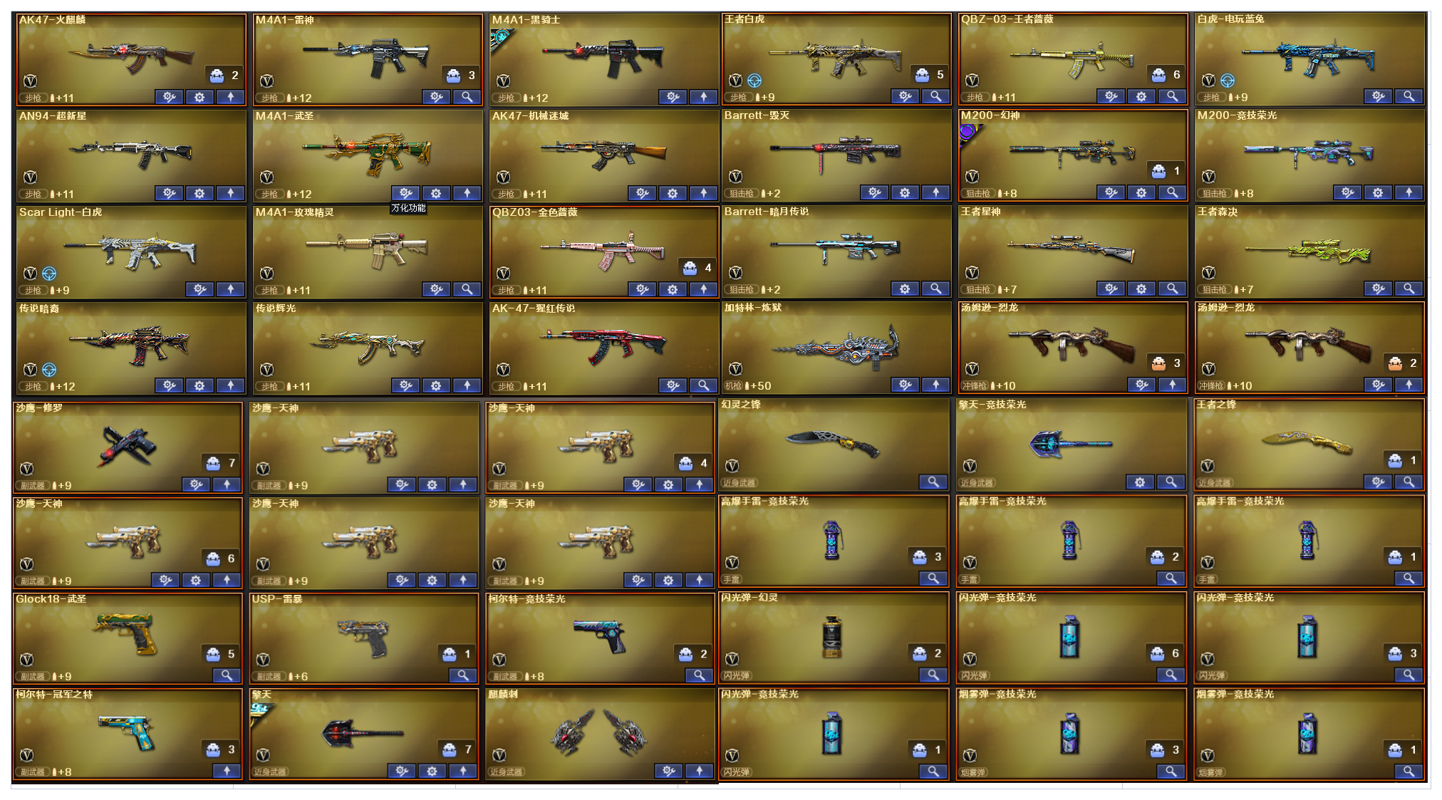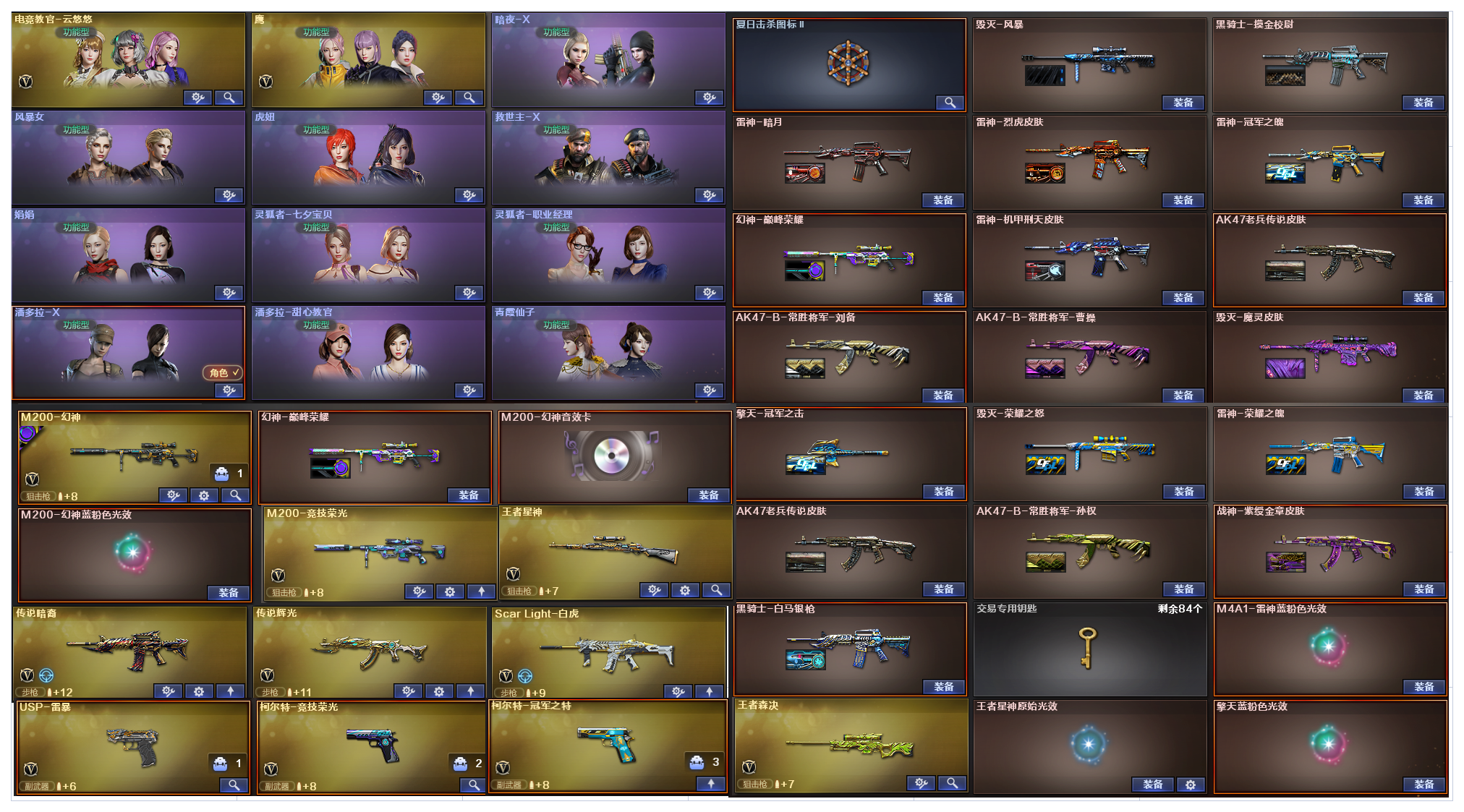 幻神⭐荣耀皮肤⭐幻神卡⭐竞技荣光套⭐传说暗裔⭐传说辉光/3把白虎⭐冠军之特⭐USP雷暴⭐王者星神;USP-雷暴,柯尔特-冠军之特,电竞教官-云悠悠,QBZ03-金色蔷薇,M200-幻神,Scar Light-白虎,传说暗裔,