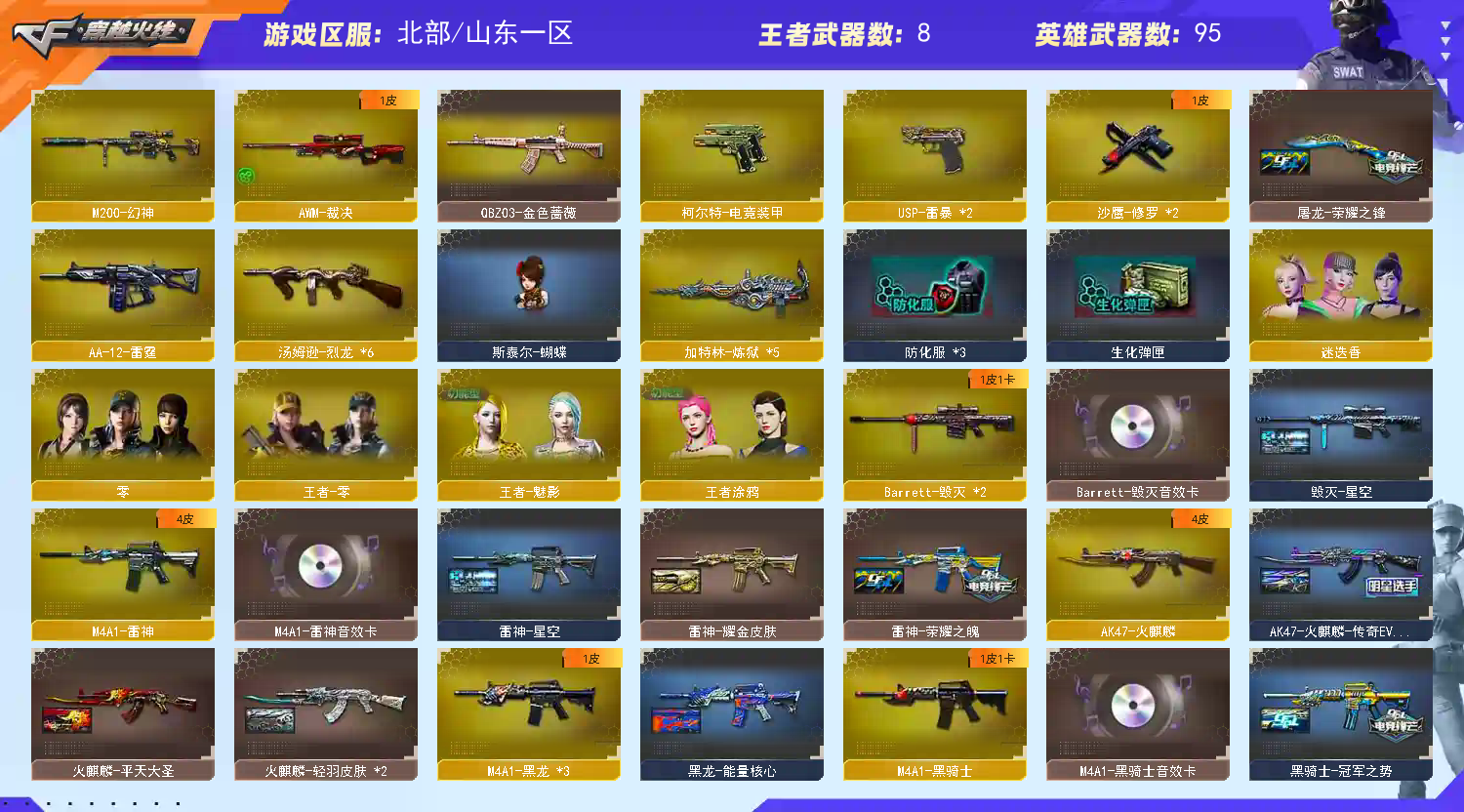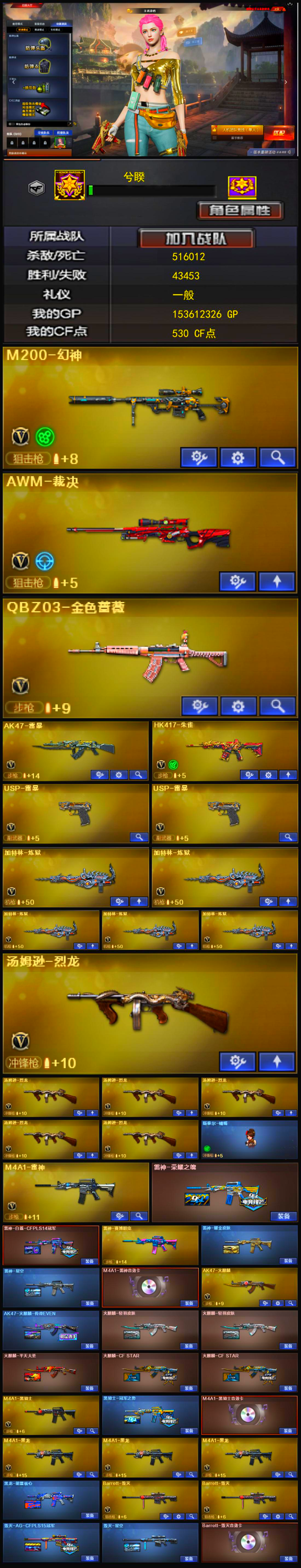 可排位100V/M200-幻神/6烈+蝴蝶/双雷暴+QBZ蔷薇+7音效满副爆破生化全装号;USP-雷暴,QBZ03-金色蔷薇,M200-幻神,