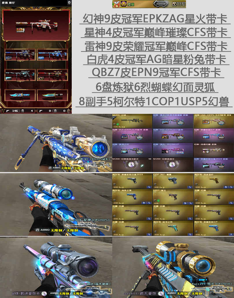 好好玩呗!别开!都去开封号了别人玩啥!求放过!不要退排位哦!退排位禁赛了,别人怎么玩!谢谢!不要退排位!时间不够了了就加时!网费不够了就下机!幻灵全家桶首发加利尔天袭天戎9皮幻神KZN9QBZ百城月冠世冠EP全套电竞之星百战金芒幻兽对掏;柯尔特-荣耀世冠白鲨2023,柯尔特-冠军之特,Knife-冠军之刃,隼,RPK-盘龙,QBZ03-金色蔷薇,G36C-幻影,