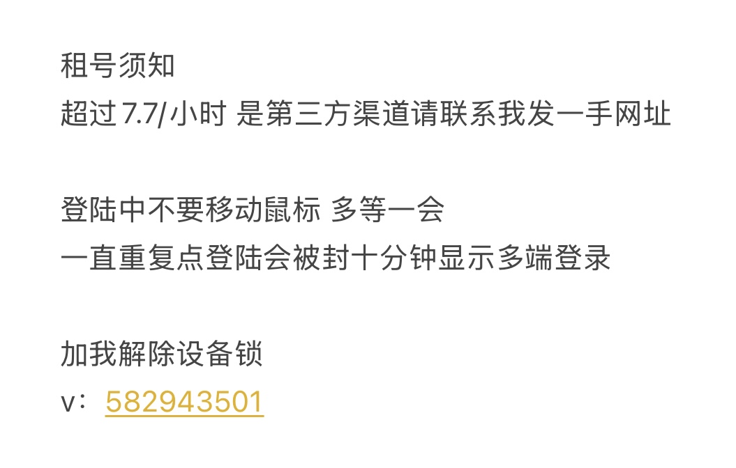 • 租号限制:起租时间2小时,租号0次及以上才可租用此号