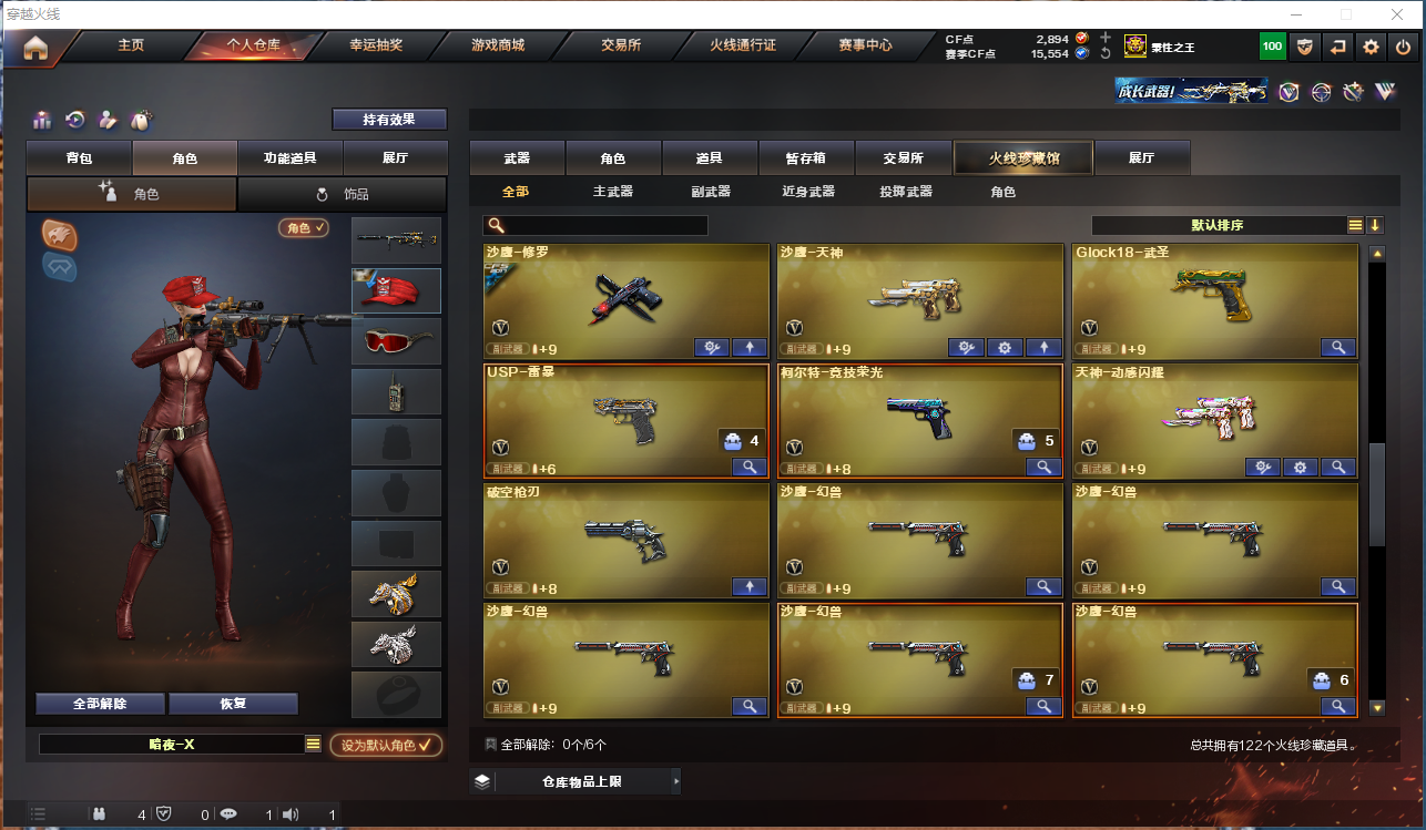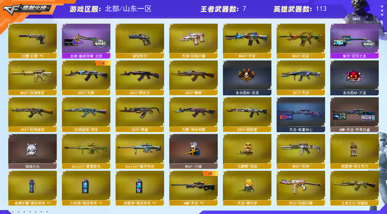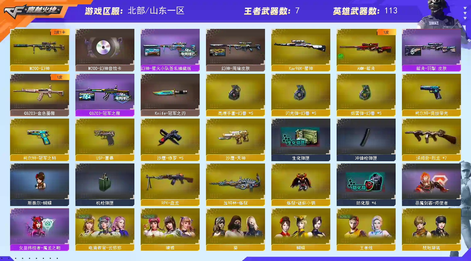 【角色】电竞教官-云悠悠,蝴蝶,葵,乔伊教练,王者炫, 【主武器】M200-幻神,M4A1-千变,AK47-火麒麟,AK47-麒麟,M4A1-黑龙,M4A1-黑龙,M4A1-黑骑士,AK47-黑武士,AK12-天启,AN94-超新星,M4A1-武圣,AK47-机械迷城,AK47-黑鲨,无影-神兵利器,M4A1-玫瑰精灵,QBZ95-幻兽,QBZ03-金色蔷薇,烈火-动感闪耀,白虎-电玩蓝兔,M4A1-赤狱骑士,AWM-天龙,Barrett-毁灭,Barrett-极光,AWM-裁决,Kar98K-星神,m200-竞技荣光,RPK-盘龙,加特林-炼狱,炼狱-迷你小钢,汤姆逊-烈龙*,7,斯泰尔-蝴蝶,炫金武士,王者之心,王者之幻,王者之势,王者之光,王者之力,王者之怒, 【副武器】沙鹰-修罗沙鹰-天神,Glock18-武圣,USP-雷暴,柯尔特-竞技荣光,天神-动感闪耀,破空枪刃,沙鹰-幻兽,柯尔特-冠军之特, 【近身武器】屠龙,龙啸,擎天,麒麟刺,擎天-竞技荣光套,屠龙-动感闪耀,女皇利刃-幻兽,龙啸-烈火龙威,王者之击, 【投掷武器】竞技荣光套,幻兽套, 【音效卡】m200-幻神音效卡,M4A1-黑龙音效卡,Barrett-毁灭音效卡, 【皮肤】幻神-星火小队签名臻藏版,幻神-周瑜。黑骑士-摸金校尉,裁决-羽掣皮肤,QBZ03-冠军之薇,雷神-R.LGD-CFPLS冠军,擎天-冠军之击,雷神-宇航图皮肤, 毁灭-直播专属,黑龙-能量核心,火麒麟-心动糖果,毁灭-墨兰皮肤,雷神-杨戬,黑骑士耀金皮肤,无影耀金皮肤,毁灭-星空,黑龙-能量核心,雷神-能量核心,修罗-CFS2018.极光-能量核心,雷神-暗月,AK47-B -常胜将军-刘备,天龙-能量核心,AK47-B -常胜将军-孙权,战神-流金岁月皮肤,毁灭-青帝,雷神-暗月,火麒麟-雷神,黑骑士-冠军之势,雷神-能量核心,火麒麟-CFSTAR,;USP-雷暴,柯尔特-冠军之特,Knife-冠军之刃,电竞教官-云悠悠,晴雅,RPK-盘龙,QBZ03-金色蔷薇,