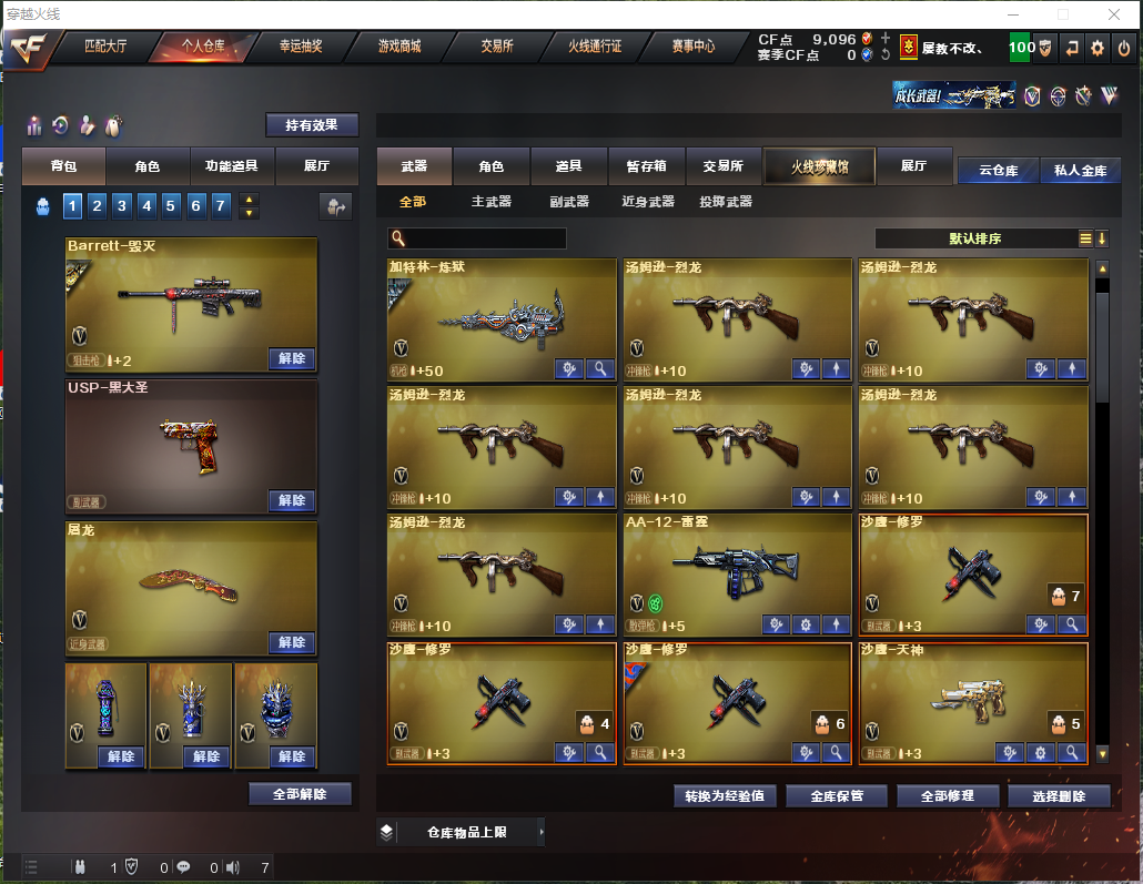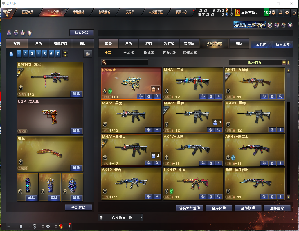 【主武器》M200-幻神/炼狱/⑥烈龙⑥盘龙/朱雀/千变/火麒麟/黑龙/2雷神/黑骑士/无影/黑武士/天启/无影/蔷薇qbz/超新星热带奇洋/烈火/王者之心觉醒/王者之势觉醒/天龙/毁灭/极光/蔷薇大炮/AA12雷霆/雷神精英刀锋/王者之武/王者之影/深渊巨龙咆哮3/死亡之眼/海滩汪汪巴雷特/ 【副武器】传说破晓/③修罗/天神/涂鸦手枪 【近身武器】屠龙/擎天/龙啸热带奇洋/龙啸云海游龙/黄金尼泊尔/迷你白虎/迷你牛牛/迷你深渊冰龙/手斧镜/ 【角色】传说影煞+四防/王者空+四防/王者瞳闭月羞花/奇洋探员/修道士/灵狐者黄金海岸/对讲机/炫彩背包/金蛇戒/银蛇戒 【手雷】③迷你生化雷/高爆竞技荣光/②高爆云龙/手雷热带奇洋 【皮肤】毁灭-耀金-秦师皮肤/雷神-星空皮肤/炼狱-星空皮肤/黑骑士-耀金皮肤 【音效卡】毁灭音效卡/黑骑士音效卡/ 【道具】紫金大元首/全背包/VIP/烟雾头/AC/闪光镜/钩子/防化服/变异宝贝/疯狂宝贝/灵魂忍者/迷雾幽灵/绿巨人/妖姬/手枪/步枪/冲锋枪/机枪/生化弹夹/生化爆破全装;炽芒蝶刃,传说影煞,RPK-盘龙,QBZ03-金色蔷薇,M200-幻神,Scar Light-白虎,Kar98K-星神,