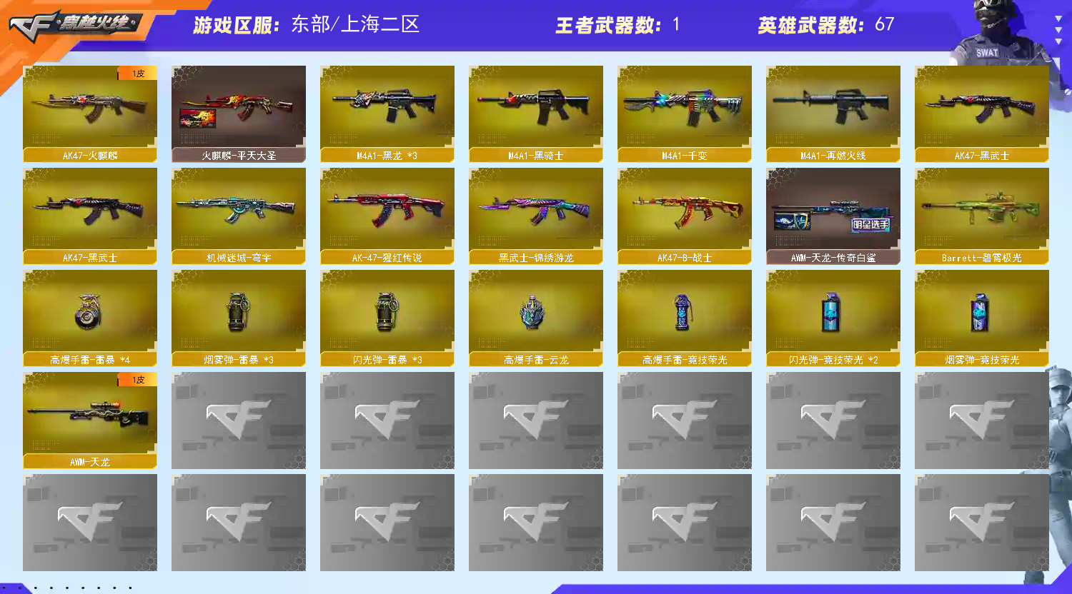 【主武器】M200-幻神/白虎-枪娘安妮/八面玲珑满级/斯太尔蝴蝶/炼狱/⑥烈龙⑥盘龙/千变/火麒麟/裁决/黑骑士/③黑龙/2雷神/黑武士/天龙/毁灭/朱雀蛇隐宗/黑龙吞噬者/神圣爆裂者+末日3/激光毁灭者3/冰龙/死亡之眼庆典CFS2021/猩红司令玩偶M37/EVO赤血龙魂/ 【副武器】④修罗/②天神/MAC-10-远古神话/⑥涂鸦手枪 【近身武器】②炽芒蝶刃/2屠龙/2龙啸/擎天/麒麟刺/斩神刀雷暴/迷你钢铁终结者/剧毒匕首毒蝰/②双股剑秦师/黄金尼泊尔/迷你牛牛/迷你白虎/迷你深渊冰龙/②手斧镜 【投掷武器】③迷你生化手雷/④高爆雷暴+烟闪/高爆竞技荣光+烟闪/高爆云龙+烟闪/高爆古蛇迷踪/ 【角色】传说影煞+四防/隼/蛇隐宗/葵/零/灵狐者黄金海岸/对讲机/炫彩背包/真龙戒/圣灵戒/魔龙戒 【皮肤】炽芒蝶刃-荣耀世冠白鲨2023皮肤/炽芒蝶刃-破浪逐光皮肤/炼狱-钟馗皮肤/屠龙-破浪逐光皮肤/雷神-化蛇皮肤/毁灭-百城浙江皮肤/毁灭-秦师皮肤/天龙-传奇白鲨 【音效卡】0 【道具】紫金大元首/全背包/vip6/变异宝贝/灵魂忍者/疯狂宝贝/迷雾幽灵/妖姬/绿巨人/步枪/冲锋枪/机枪/生化弹夹/机械猎手幻灵猎姬皮肤/终极猎手荒漠刀客皮肤/终极猎手秦魂将军皮肤/生化爆破全装;炽芒蝶刃,传说影煞,隼,RPK-盘龙,M200-幻神,