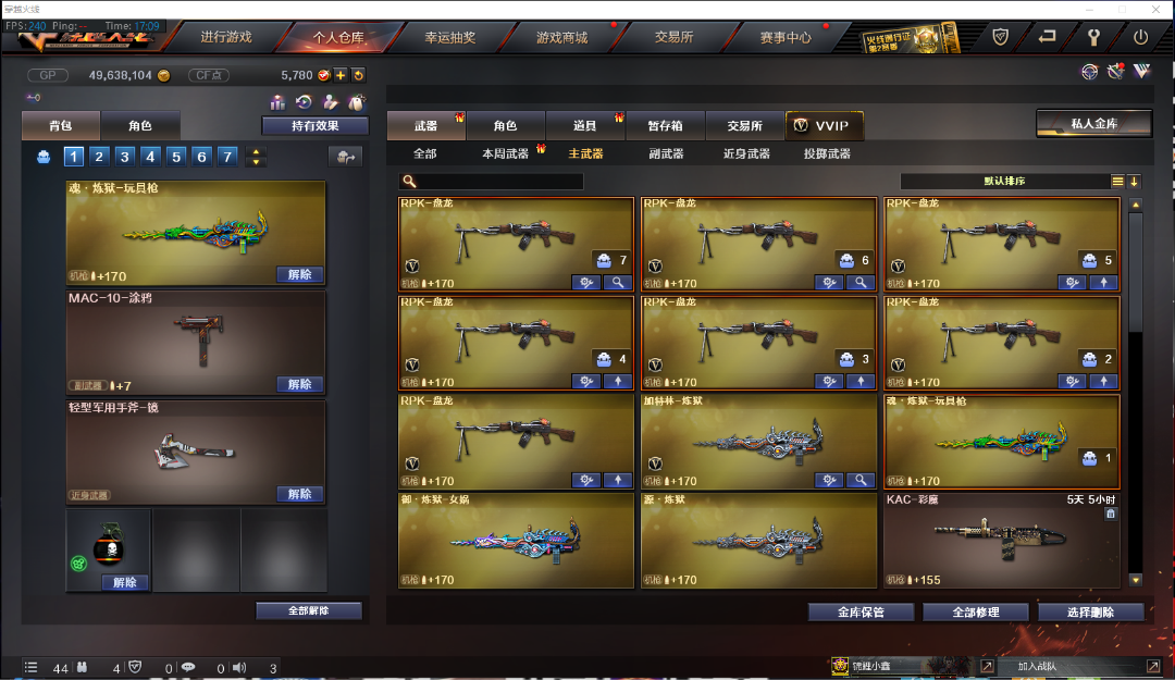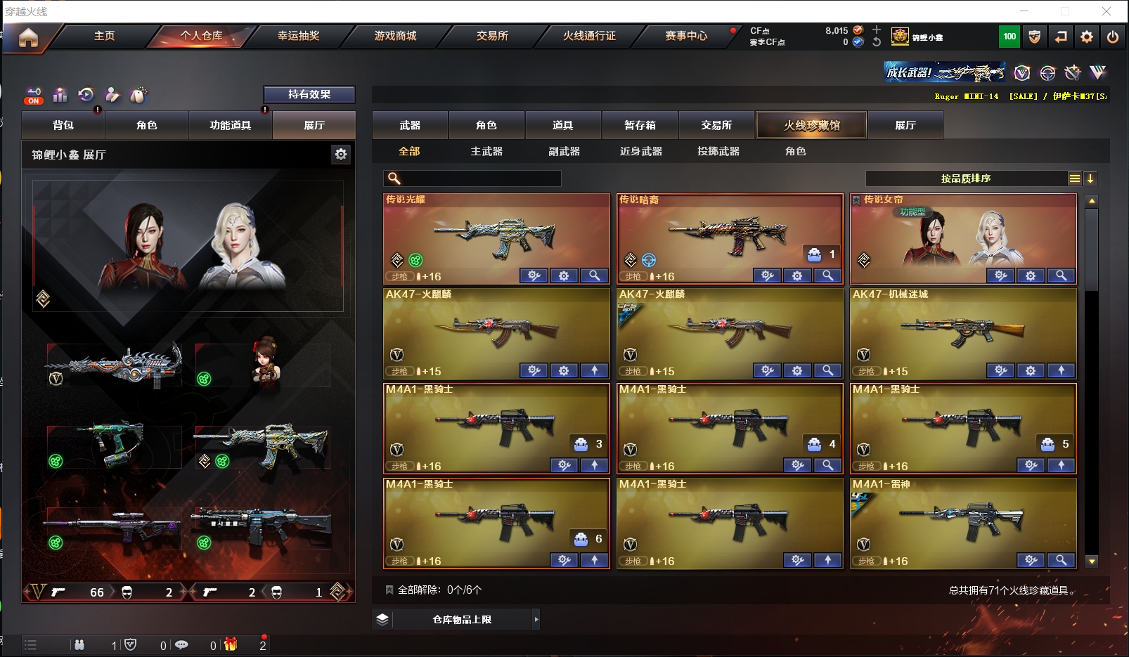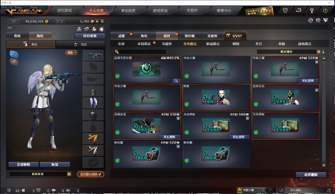 角色:4防传说女帝 四防荒漠琉璃 武器: 六盘龙 六烈龙 斯泰尔-蝴蝶 加特林-炼狱 毒峰 双面神 M4A1-传说光耀 轻型军用手斧-镜 生化手雷 HK12-领域力场 传说暗裔 QBZ03-王者蔷薇 道具:生化弹夹 冲锋枪弹夹 机枪弹夹 防化服 夺命之镰 超级对讲机 防弹衣 防弹头盔 闪光镜 手雷包。;传说女帝,RPK-盘龙,传说暗裔,