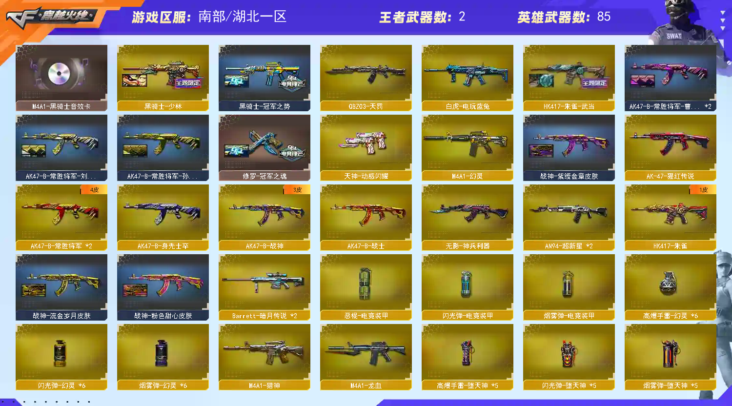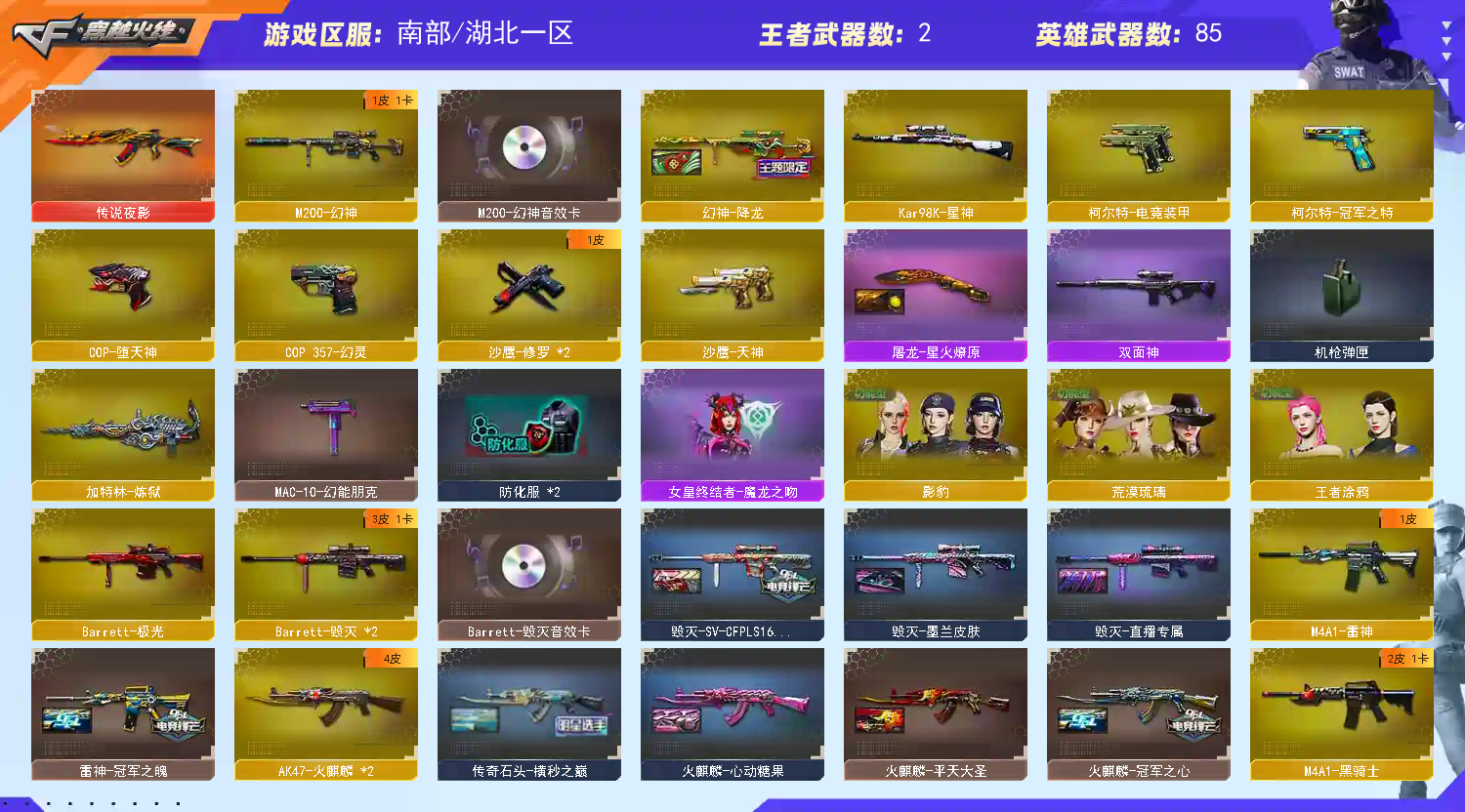 湖北一区-86V-2王者-3炫金 【传说武器】:传说夜影 【热门武器】:传说夜影,HK417-朱雀,M200-幻神,白虎-电玩蓝兔,柯尔特-冠军之特,Kar98K-星神,M4A1-黑骑士,加特林-炼狱,雷神-小红*2,COP-堕天神,COP 357-幻灵,沙鹰-修罗*2,炽芒蝶刃,黄金猫猫手套-白鲨,金刚伞 【王者炫金武器】:炫金骑士,炫金千变,炫金雷神 【音效卡】:M200-幻神音效卡,M4A1-黑骑士音效卡,Barrett-毁灭音效卡,70KG语音包 【稀有皮肤】:幻神-降龙,雷神-冠军之魄,火麒麟-冠军之心,传奇石头-横秒之巅,火麒麟-平天大圣,火麒麟-心动糖果,黑骑士-冠军之势,毁灭-SV-CFPLS16冠军,HK417-朱雀-武当,修罗-冠军之魂,屠龙-星火燎原 【角色】:王者涂鸦,影豹,女主播,荒漠琉璃,职业选手,暗黑审判 【人偶武器】:雷神-小红*2,巴雷特-零-水下丽影*2,AWM-灵狐-15周年嘉年华,海滩汪汪-巴雷特,迷你超能女侍,生化手雷-机甲核心,闪光弹-小乔,闪光弹-貂蝉,高爆手雷-大乔 【暴走生化】:双面神 【挑战大师】:机甲撕裂者III,神圣爆裂者-末日III,激光毁灭者III-白马银枪,冰龙粉碎者-白马银枪*2 【英雄级武器】:M4A1-幻灵,COP 357-幻灵,幻灵之锋,柯尔特-电竞装甲,COP-堕天神,麒麟刺-堕天神,龙啸-堕天神*4,烈火-动感闪耀,天神-动感闪耀,屠龙-动感闪耀,手雷-动感闪耀,HK417-朱雀,白虎-电玩蓝兔,无影-神兵利器,M4A1-雷神,M4A1-黑骑士,加特林-炼狱,AK47-火麒麟*2,AN94-超新星*2,Barrett-毁灭*2,Barrett-极光,M4A1-龙血,QBZ03-天罚,Kar98K-星神,M200-幻神,M4A1-猎神,AK-47-猩红传说,AK47-B-战神,AK47-B-常胜将军*2,柯尔特-冠军之特,沙鹰-天神,沙鹰-修罗*2,炽芒蝶刃,麒麟刺,屠龙 【特殊枪械】:0白虎,1黑骑士,0烈龙,0盘龙,1炼狱,0蝴蝶斯泰尔;柯尔特-冠军之特,炽芒蝶刃,M200-幻神,Kar98K-星神,