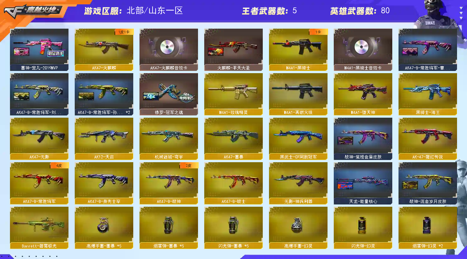 传说圣灵】【M200-幻神+M200-幻神-黄忠皮肤】【AWM-裁决】【王者之心-觉醒版/王者之灵-觉醒版/】【沙鹰-天神(2)/天神-CF网剧冠军/沙鹰-修罗(3)/USP-雷暴】【麒麟刺/麒麟刺-堕天神/龙啸(2)/王者之啸-觉醒版/擎天(2)/擎天-CF网剧冠军/屠龙(2)/王者之锋-觉醒版/斩神刀-雷暴/麒麟刺-百战金芒 】【网剧冠军套装/雷暴套装】【汤姆逊-烈龙(6)/加特林-炼狱(2)】【斯泰尔-蝴蝶】【迷迭香/战地猎狐/零·纪元/王者-魅影/王者-瞳-闭月羞花/王者玲珑/葵-阿尔法武装/职业选手/灵狐者-职业经理】【毁灭-BEAN-2020MVP/毁灭-星空/毁灭-黑大圣皮肤/天龙-CFSTAR/天龙-能量核心/火麒麟-CFSTAR/火麒麟-AG/火麒麟-平天大圣/AK47-B-常胜将军-刘备/AK47-B-常胜将军-孙权/AK47-B-常胜将军-曹操/雷神-源计划2.0专属 皮肤/雷神-宠儿-2019MVP/雷神-暗月/雷神-烈虎皮肤/雷神-星空/战神-流金岁月皮肤/战神-紫绶金章皮肤/炼狱-月 皮肤/修罗-冠军之魂/修罗-CFSTAR/麒麟刺-月皮肤/屠龙-荣耀之锋】【M4A1-雷神音效卡/M4A1-黑骑士音效卡/AK47-火麒麟音效卡/Barrett-毁灭音效卡/Barrett-碧霄极光音效卡/炼狱-百战金芒-庆典舞曲音效卡】【Barrett-毁灭/AWM-天龙/M4A1-堕天神/M4A1-雷神(2)/M4A1-黑骑士/黑骑士-海王/M4A1-猎神/M4A1-玫瑰精灵/Scar Light-白虎/AK12-天启/AK47-火麒麟/AK47-无影/无影-神兵利器/AK47-雷暴/黑武士-CF网剧冠军/AK-47-猩红传说/AK47-B-身先士卒/AK47-B-常胜将军/AK47-B-战神/QBZ03-金色蔷薇/超新星-悦享-觉醒版/9A91-烈火/机械迷城-穹宇/Barrett-碧霄极光】;USP-雷暴,QBZ03-金色蔷薇,M200-幻神,Scar Light-白虎,