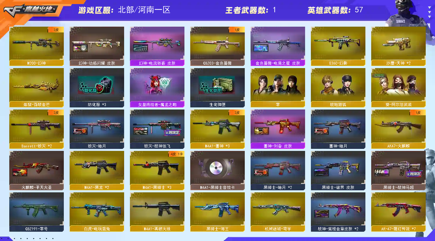 首页 > 租号大厅 > 穿越火线 > 网通区/河南一区 > 爆破/幻神+白虎蓝兔+幻影+QBZ+毁灭+雷神+黑骑士+ 黑龙+火麒麟 +炼狱