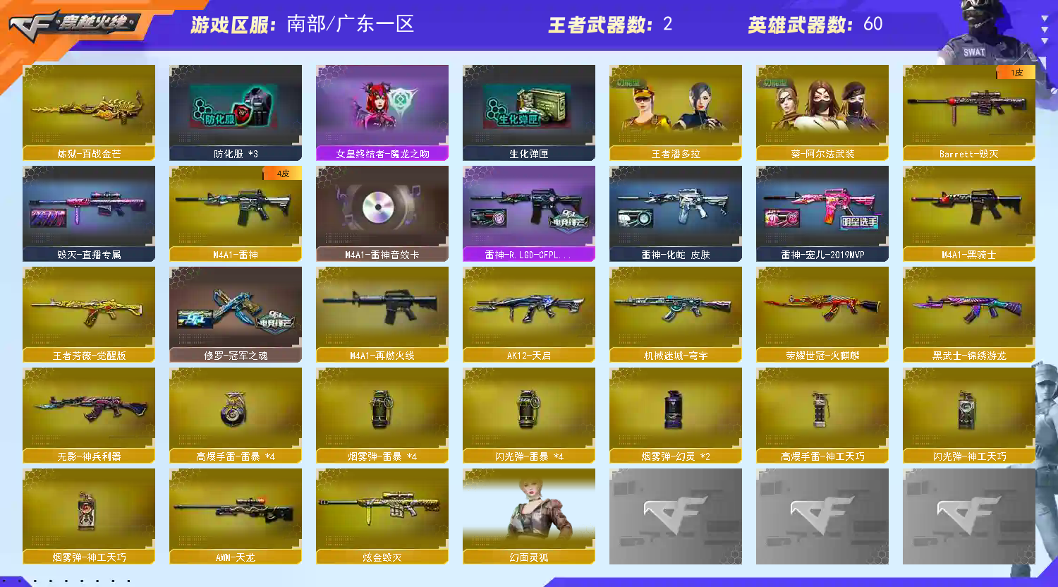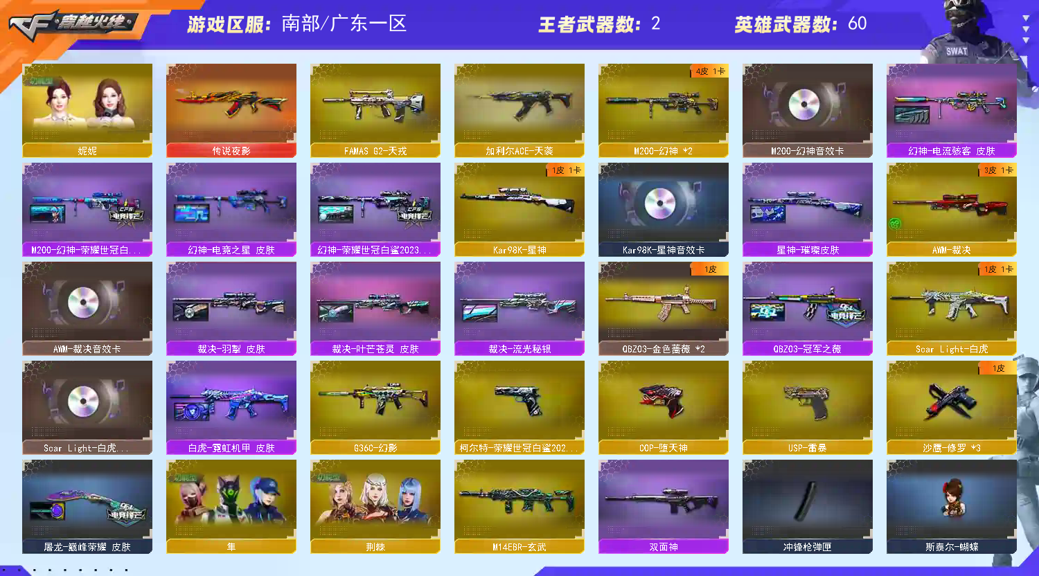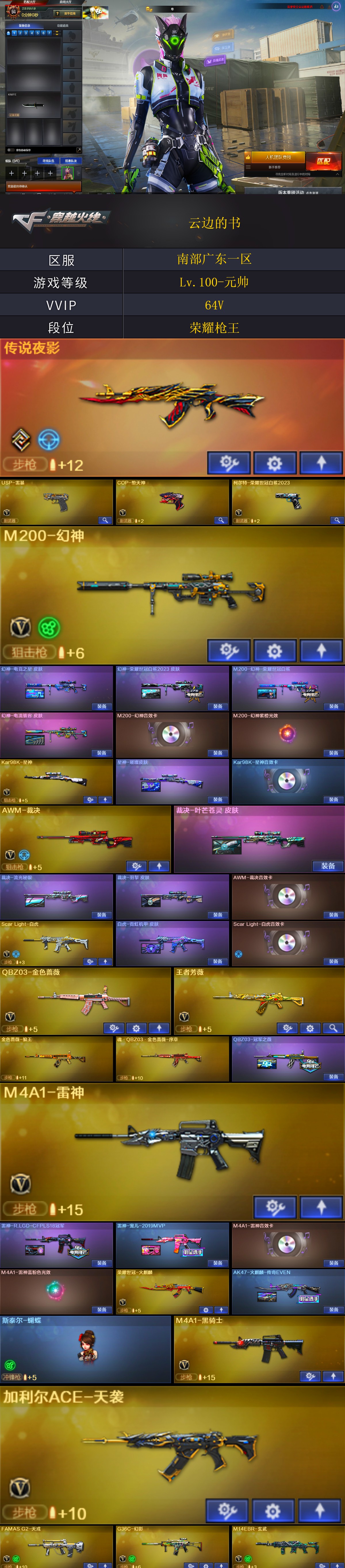 【商品标题】:南部广东一区-64V-可二次实名-【Lv.100-元帅】-【段位:荣耀枪王】 【稀有武器】:传说夜影/M200-幻神/Kar98K-星神/G36C-幻影/ScarLight-白虎/M14EBR-玄武/USP-雷暴/COP-堕天神/柯尔特-荣耀世冠白鲨2023/QBZ03-金色蔷薇/M4A1-雷神/M4A1-黑骑士/荣耀世冠-火麒麟/Barrett-毁灭/AWM-裁决/斩神刀-雷暴 【王者武器】:王者芳薇-觉醒版 【热门角色】:隼/奇洋探员/王者潘多拉/女主播/潘多拉 【热门音效卡】:M200-幻神音效卡/Kar98K-星神音效卡/AWM-裁决音效卡/Scar Light-白虎音效卡/M4A1-雷神音效卡 【热门皮肤】:幻神-荣耀世冠白鲨2023皮肤/M200-幻神-荣耀世冠白鲨/幻神-电流骇客皮肤/裁决-羽掣皮肤/雷神-R.LGD-CFPLS18冠军/QBZ03-冠军之薇/白虎-霓虹机甲 皮肤/星神-璀璨皮肤/裁决-流光秘银/毁灭-直播专属/屠龙-巅峰荣耀皮肤/雷神-宠儿-2019MVP/AK47-火麒麟-传奇EVEN 【其他亮点】:斯泰尔-蝴蝶 (截图展示段位不代表实际段位,如赛季更新等不可抗拒因素发生变化,其余道具看截图或咨询客服);USP-雷暴,柯尔特-荣耀世冠白鲨2023,隼,妮妮,QBZ03-金色蔷薇,G36C-幻影,M200-幻神,