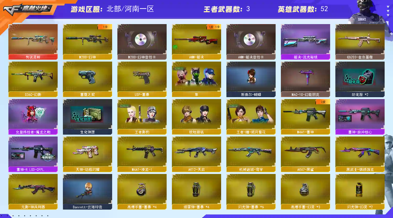 【王者武器】:【炫金毁灭-1,王者风势-觉醒版-1】 【英雄武器】:【AK12-天启-1,麒麟刺-1,M4A1-雷神-1,M200-幻神-1,USP-雷暴-1,烈龙-云海游龙-1,高爆手雷-雷暴-4,闪光弹-雷暴-6,烟雾弹-雷暴-4,斩神刀-雷暴-1,幻灵之锋-2,炽芒蝶刃-1,无影-神兵利器-1,QBZ03-金色蔷薇-1,G36C-幻影-1,烈火-动感闪耀-1,手雷-动感闪耀-1,天神-动感闪耀-1,擎天-云海游龙-1,屠龙-动感闪耀-1,Barrett-云海玲珑-1,超新星-热带奇洋-1,黑武士-锦绣游龙-1,龙啸-热带奇洋-1,手雷-热带奇洋-1,AWM-裁决-1,烟雾弹-幻灵-3,闪光弹-幻灵-2,雷霆之契-1,高爆手雷-幻灵-3,传说灵眸-1,AK47-黑鲨-1,手雷-云海游龙-1】 【装饰品】:【火麒麟-CF STAR-1,修罗-CF STAR-1,悦动玩偶-1,泰迪娃娃-1,雷神-脉冲核心-1,雷神-R.LGD-CFPLS18冠军-1,裁决-流光秘银-1,魅影玩偶-1】 【角色】:【金戈,堕天使,猎狐者,嘉年华灵狐,木兰,游珑儿,救世复仇,威锋,王者影豹,王者-瞳-闭月羞花,精英部队,隼,兰-限定版,麻雀,蜀雪】 【道具】:【超级背包-1,烟雾保护头盔-1,闪光护目镜-1,防弹衣-1,防弹头盔-1,手雷包-1,C4工具钳-1,防化服-1,夺命之镰-1,灵魂忍者-1,疯狂宝贝-1,迷雾幽灵-1,生化弹匣-1,彩蝶之翼-1,C4-红龙-1,M200-幻神音效卡-1,天使之翼-1,绿色巨人-1,AWM-裁决音效卡-1,全能枪王黄金面具-1】;USP-雷暴,炽芒蝶刃,隼,QBZ03-金色蔷薇,G36C-幻影,M200-幻神,传说灵眸,