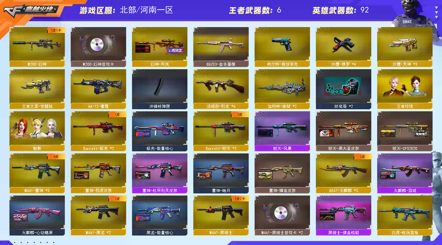 首页 > 租号大厅 > 穿越火线 > 网通区/河南一区 > M00幻神丹凤+幻神音效卡+王者星神+朱雀白虎六烈龙金色蔷薇四防角色幻神三件套