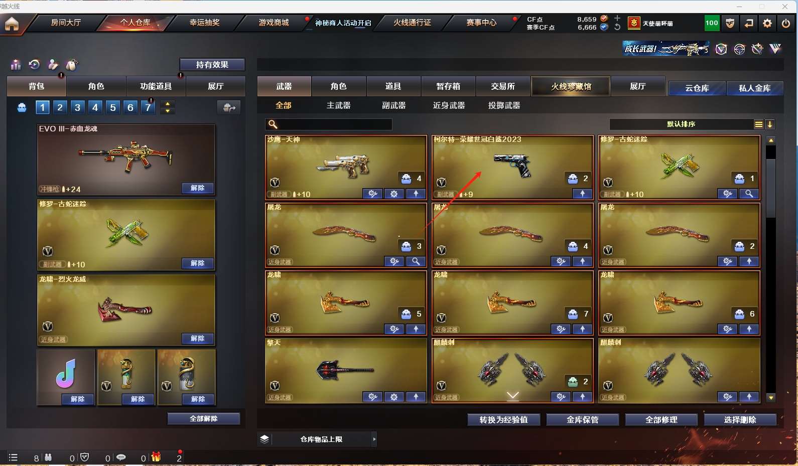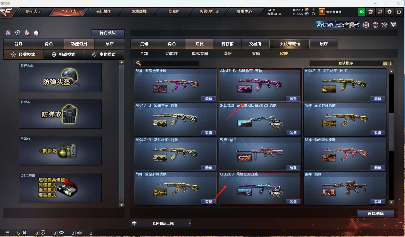 【m200-幻神+幻神-荣耀世冠白鲨2023+电流骇客】 【98k星神+音效卡+呛娘默】 【g36c幻影】 【王者白虎】 【qbz金色蔷薇+量子蔷薇+荣耀世冠白鲨】 【qbz银翼】 【火麒麟】 【麒麟】 【黑龙】 【雷神+雷神-白鲨14冠军】 【黑骑士+音效卡+白马银呛】 【毁灭+音效卡】 【极光】 【裁决】 【王者之魄 王者火魄】 【千变 天启 机械迷城 玫瑰精灵 猎神】 【生化 4炼狱 5烈龙】 【8手呛 柯尔特荣耀世冠白鲨2023 修罗*4 天神*2】 【12近战 屠龙*3 龙啸*3 擎天 麒麟刺*2 王者之啸 王者之击】 【四防 王者魅影】 【角色 葵 零 研 樱 月兔特工 蛇隐宗】 【星神音效卡 黑骑士音效卡 毁灭音效卡】 【炽芒蝶刃-荣耀世冠白鲨2023】 【猫猫手套】 【动感闪耀炫彩背包 炫彩背包 bs炫彩背包】;柯尔特-荣耀世冠白鲨2023,QBZ03-金色蔷薇,G36C-幻影,M200-幻神,Kar98K-星神,