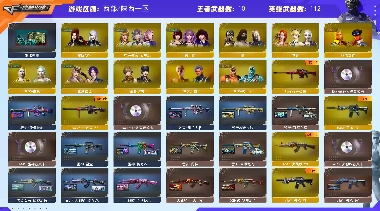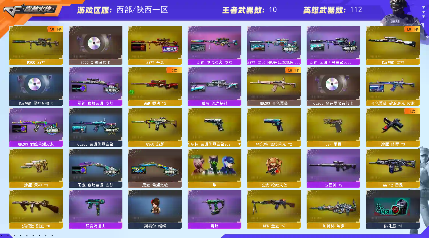 王者武器:炫金天龙;炫金武士;炫金无影;炫金黑龙;王者之幻-觉醒版;王者之怒-觉醒版;王者之魂-觉醒版;王者炎心-觉醒版;炫金骑士;炫金超新星;炫金修罗 英雄武器:M4A1-死神;AK12-天启;AN94-超新星;M4A1-黑骑士;M4A1-玫瑰精灵;屠龙;AK47-机械迷城;龙啸;AK47-无影;麒麟刺;AK47-火麒麟;AWM-天龙;Barrett-毁灭;汤姆逊-烈龙;Barrett-极光;RPK-盘龙;沙鹰-修罗;加特林-炼狱;沙鹰-天神;M4A1-雷神;M4A1-黑龙;9A91-烈火;M200-幻神;USP-雷暴;黑武士-CF网剧冠军;闪光弹-雷霆;烟雾弹-雷暴;M200-竞技荣光;天神-CF网剧冠军;擎天-CF网剧冠军;擎天-竞技荣光;柯尔特-竞技荣光;烟雾弹-竞技荣光;闪光弹-竞技荣光;高爆手雷-竞技荣光;AK-47-猩红传说;无影-神兵利器;AA-12-雷霆;QBZ03-金色蔷薇;HK417-朱雀;G36C-幻影;柯尔特-荣耀世冠白鲨2023;超新星-热带奇洋;Kar98K-星神;龙啸-热带奇洋;手雷-热带奇洋;高爆手雷-云龙;闪光弹-云龙;擎天;AWM-裁决;M4A1-猎神;AK47-黑鲨;M4A1-龙血;Barrett-朱雀 装饰品:火麒麟-CF STAR;修罗-CF STAR;黑龙-暗月;无影-能量核心;极光-能量核心;修罗-能量核心;神秘男孩玩偶;巨人玩偶;悦动玩偶;铁骑玩偶;泰迪娃娃;王者刀锋玩偶;击杀图标-圣诞;击杀图标-万圣;AWM-天龙-传奇白鲨;炽芒蝶刃-荣耀世冠白鲨2023 皮肤;AWM-天龙-传奇70KG;幻神-荣耀世冠白鲨2023 皮肤;暴躁猪猪玩偶;毁灭-冠军之怒;浣熊玩偶;M4A1-千变-孔明皮肤;AK47-火麒麟-传奇EVEN;传奇石头-横秒之巅;火麒麟-平天大圣;曼陀罗玩偶;M4A1-黑龙-361;雷神-虎将;火麒麟-心动糖果;火麒麟-华夏之心;炫羊玩偶;黑骑士耀金皮肤;无影耀金皮肤;雷神-星空;火麒麟玩偶;QBZ03-荣耀世冠白鲨;AK47-B-常胜将军-刘备;小兔姬玩偶;孙悟空玩偶;屠龙-荣耀之锋;雷神-荣耀之魄;毁灭耀金皮肤;幻神-星火小队签名臻藏版 皮肤;击杀图标-16周年限定;幻神-丹凤;麒麟刺-荣耀世冠白鲨;毁灭-墨兰 皮肤;裁决-流光秘银;金色蔷薇-破浪逐光 皮肤;QBZ03-巅峰荣耀 皮肤;星神-巅峰荣耀 皮肤;魅影玩偶;雷神-传奇N9;修罗-冠军之魂;屠龙-巅峰荣耀 皮肤 角色:魅影;金戈;陈龙野-X;王者之瞳;葵;堕天使;复仇者;幻影;雷豹;铁骑;飞虎队;猎狐者;曼陀罗;夜玫瑰;灵狐者;潜龙队;嘉年华灵狐;木兰;娜塔莉娅;毒蝎-X;疾风;救世复仇;救世主;王力宏;关小雨;电竞教官-云悠悠;王者-救世主;圣诞潘多拉-X;影武者-X;剑齿虎-X;风暴女;烈锋;猎狐者-X;斯沃特精英;狐妖儿;空;影武者;星际战将;代号:翼;新娜塔莎;娟娟;娜塔莎;隼;兰-限定版;麻雀;化蛇;玫瑰花神;炽天使;王者-魅影;智影;兔囡囡;芳心审判者;沃特-X 道具:(极限战斗背包);(AK47-麒麟紫橙光效);超级背包;炫彩背包;金蛇戒;银蛇戒;烟雾保护头盔;猫耳头盔;闪光护目镜;运动护目镜;防弹衣;防弹头盔;手雷包;C4工具钳;防化服;夺命之镰;变异宝贝;灵魂忍者;疯狂宝贝;迷雾幽灵;生化弹匣;步枪弹匣;机枪弹匣;冲锋枪弹匣;手枪弹匣;M4A1-雷神 紫橙光效;皇龙戒;彩蝶之翼;云螭玩偶;C4-红龙;Barrett-毁灭音效卡;M4A1-雷神音效卡;AK47-火麒麟音效卡;炫彩背包-诺拉;M4A1-黑骑士音效卡;Barrett-极光音效卡;M200-幻神音效卡;小萝莉;QBZ03-金色蔷薇音效卡;枪口火焰变形;特殊水壶-海滩派对;背包-洛丽塔;变相怪杰;天使之翼;绿色巨人;黄金头骨护目镜;兔子发带;京剧背包;Kar98K-星神音效卡;超级护目镜;大圣背包;大圣头盔;USP-雷暴,柯尔特-荣耀世冠白鲨2023,Knife-冠军之刃,隼,电竞教官-云悠悠,RPK-盘龙,QBZ03-金色蔷薇,