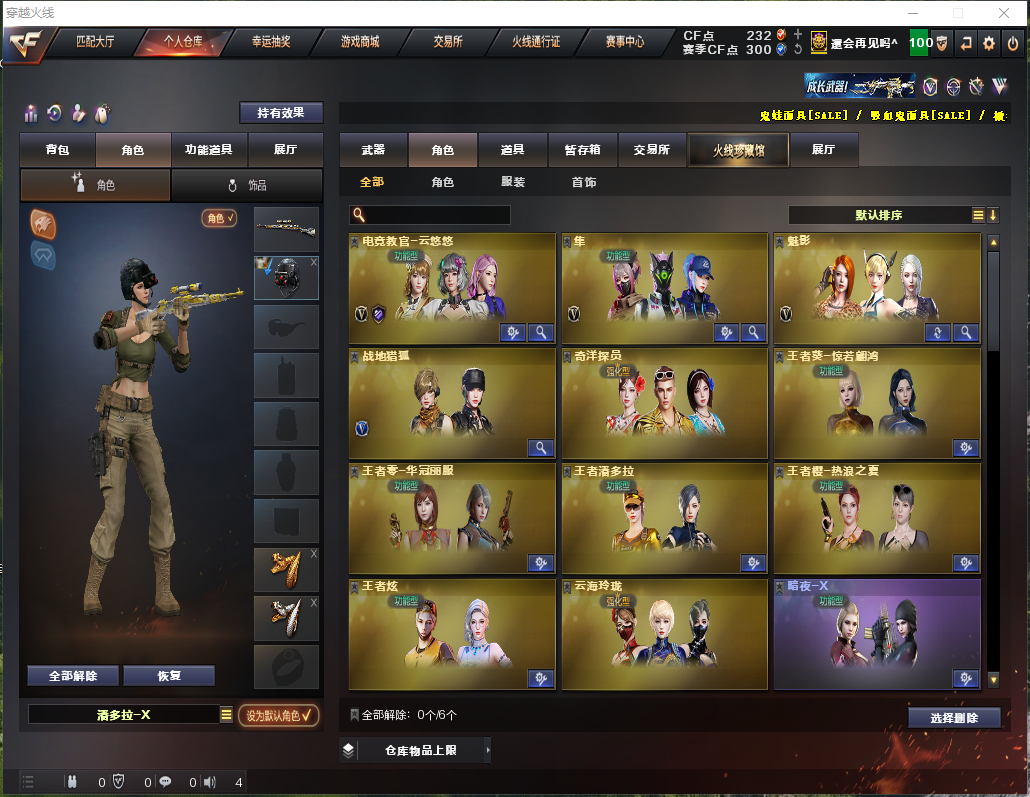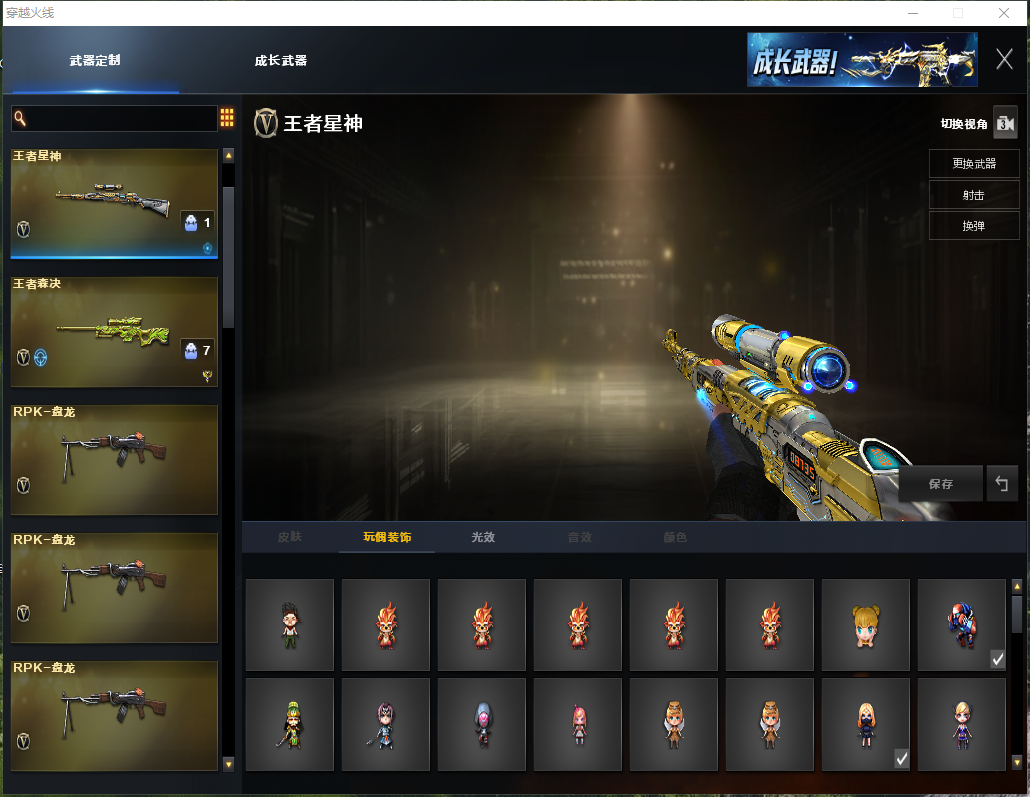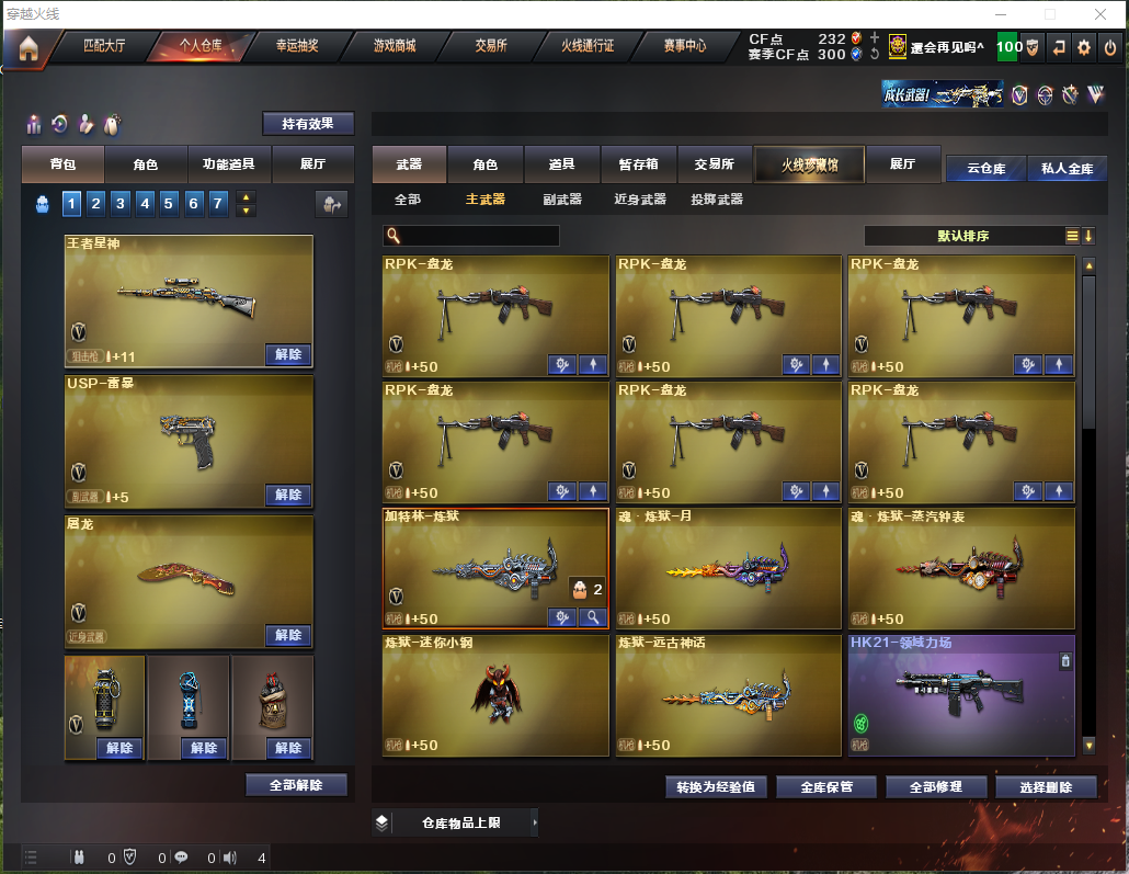 【主武器】传说灵眸/M200-幻神/王者星神觉醒/王者森决/白虎之魄觉醒/白虎电玩蓝兔/②斯太尔蝴蝶/异变清道夫/炼狱/炼狱小刚/⑥烈龙⑥盘龙/②雷神/黑龙/黑骑士/朱雀HK417/火麒麟/超新星热带奇洋/蔷薇qbz/王者之翼觉醒/双面神/HK21-领域立场/海神加特林/KAC狂怒咆哮/激光毁灭者3/神圣爆裂者+末日3/EVO赤血龙魂/MK5SS秘银/ 【副武器】COP357-幻灵/USP-雷暴/③天神/③修罗/修罗云海游龙/COP旗袍/涂鸦手枪 【近身武器】炽芒蝶刃/尼泊尔雷霆/③屠龙/②麒麟刺/斩神刀雷暴/擎天-竞技荣光/龙啸-热带奇洋/剧毒匕首毒蝰/迷你深渊冰龙/迷你波特博士/ 【手雷】②迷你生化手雷/⑤高爆雷暴+烟闪/高爆雷霆+烟闪/高爆幻灵+烟闪/③高爆竞技荣光+烟闪/手雷热带奇洋/ 【角色】隼+四防/电竞教官云悠悠+四防/王者潘多拉+爆破四防/王者炫+爆破四防/魅影/战地猎狐/奇洋探员/王者零华冠丽服/王者樱热浪之夏/云海游龙/荆棘玫瑰/兰海滩派对/零水下丽影/职业选手/对讲机/炫彩背包/金蛇戒/银蛇戒 【皮肤】幻神-星火小队签名臻藏版皮肤/幻神-黄忠皮肤/屠龙-星火燎原+春桃皮肤/毁灭-荣耀之怒+星空+耀金+格林姐妹皮肤/火麒麟-AG战队+百城皮肤/天龙-传奇白鲨皮肤/雷神-战神赵云+机甲刑天+仲达白露皮肤/ 【音效卡】炼狱音效卡/蔷薇qbz音效卡/蔷薇qbz热带奇洋音效卡/黑骑士音效卡/毁灭音效卡/极光音效卡/修罗云海游龙音效卡 【道具】紫金大元首/全背包/VIP6/烟雾头/AC/闪光镜/钩子/防化服/变异宝贝/疯狂宝贝/灵魂忍者/迷雾幽灵/绿巨人/步枪/冲锋枪/机枪/生化弹夹/终极猎手-荒漠刀客皮肤/终极猎手-秦魂将军皮肤/机械猎手-幻灵猎姬皮肤/时空猎手-幻影猎人皮肤/生化爆破全装;USP-雷暴,炽芒蝶刃,隼,电竞教官-云悠悠,RPK-盘龙,QBZ03-金色蔷薇,M200-幻神,