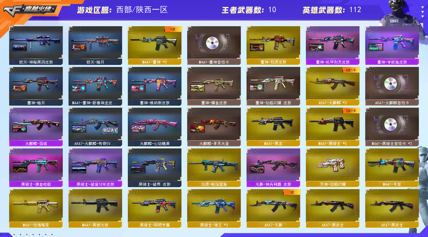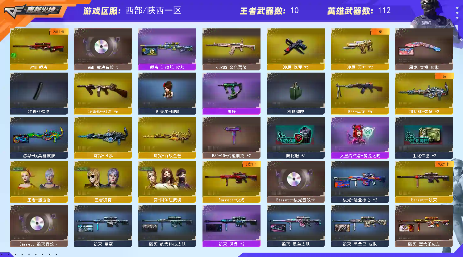 ☞温馨提示:该号财产已备案,实名租号,切勿以身试法!⓵严🈲【使用或浏览外挂等第三方软件】,毁号违法必究!⓶严🈲【恶意撤单/排位离线】!如有违🈲,平台永久拉黑/追究相应的法律责任!!!亲们,请自重自爱!素质租号!良心游戏!账号其它及具体道具请以游戏内为凖!期限道具请勿挂怀!多谢赏光!记得収藏和好评哟~ 允许排位-西部战区(电信/陕西一区),全网最低特价爆破、生化、挑战极品三全装 ★雷暴套(斩神刀-雷暴、高爆手 雷-雷暴、烟 雾 弹-雷暴、闪 光 弹-雷暴)+雷霆套(巨龙咆哮III、尼泊尔-雷霆、高爆手 雷-雷霆、烟 雾 弹-雷霆、闪 光 弹-雷霆)+ 传说套(Barrett-暗月传说、AK 47-战神、AK 47-战士、AK 47-猩红传说);★Barrett-毁灭音效卡、M4 A1-雷神音效卡、AWM-裁决音效卡、Barrett-極光音效卡;毁灭-AG-CFPLS15冠军、毁灭-星空;雷神-白鲨-CFPLS14冠军、雷神-耀金皮肤;火麒麟-传奇EVEN、火麒麟-AG战队皮肤、火麒麟-CF STAR、火麒麟-雷神★觉醒版王者火魄、觉醒版王者之魄、王者之武、王者之力、超新星-悦享、炫金无影、炫金修罗;AA12-雷霆、裁决、9A91-烈火、AK47-黑鲨、轻型手斧-镜、火麒麟-雷神★王者凌霄、王者迷迭香、灵狐者-职业经理(所有生化模式“蕞强四属性”角色)、卡塔琳娜、空(生化模式“三属性”角色)、兰-海滩派队(多人生化追击模式“蕞强三属性”角色)、零-水下丽影(双全模式“三防”属性角色)、暗夜-X、潘多拉-X;★毒蜂/斯泰尔-蝴蝶+⑥烈龙⑥盘龙②炼狱(/巨龙咆哮Ⅲ)★50步⑥全狙⑧副③近 ★多 玩偶(魔翼龙玩偶、萨满玩偶、黄金幸运猪猪玩偶、关羽玩偶、深渊红龙玩偶、终结者玩偶···) 皮肤(毁灭-AG-CFPLS15冠军、毁灭-星空;雷神-白鲨-CFPLS14冠军、雷神-耀金皮肤;火麒麟-传奇EVEN、火麒麟-AG战队皮肤、火麒麟-CF STAR、火麒麟-雷神;修罗-能量核心、修罗-CF STAR ;天神-暗月···) 光效 等;RPK-盘龙,QBZ03-金色蔷薇,