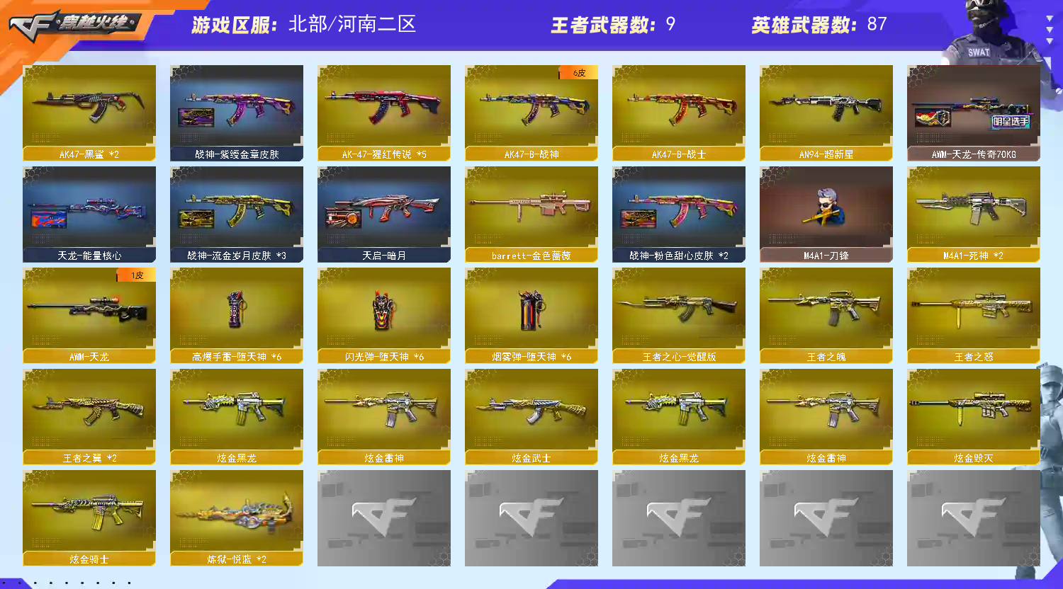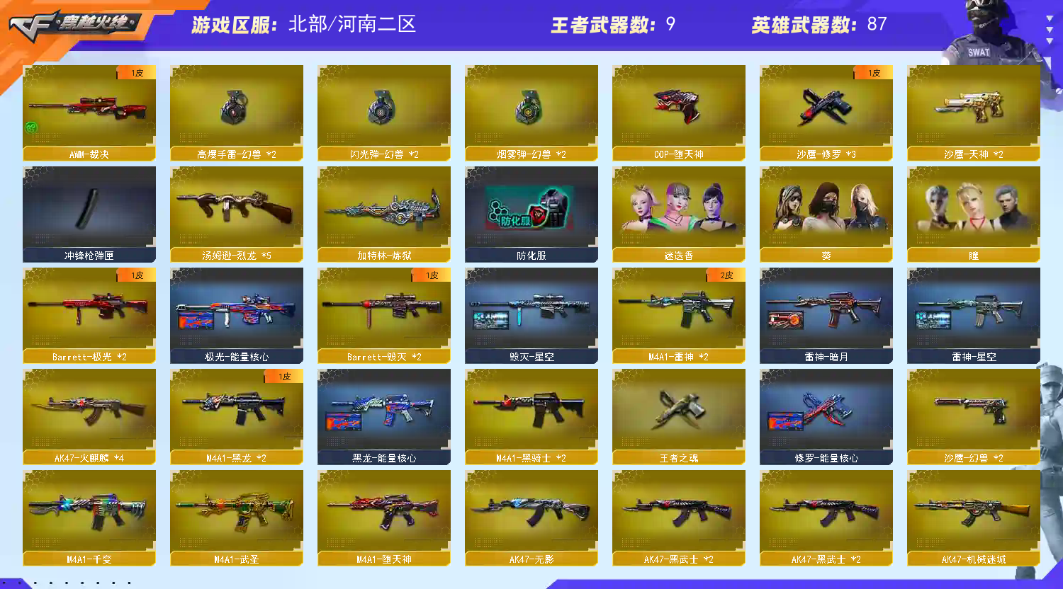 5烈死亡之眼|堕天神套装|雷神毁灭黑骑士裁决|迷迭香|生化爆破全装号 南部战区合区大区(江西一区、南方大区、湖南一区、湖南二区、湖北一区、湖北二区、广东一区、广西一区、广东二区、广东三区、广东四区)登录的时候选择湖南二区。 【编号】:HNN341 【角 色】:葵、迷迭香、瞳、风暴女、救世主-X、蜀雪、铁骑荣耀、影舞者-X、8周年戒指、双蛇戒指、双龙戒指 【主 武】:5烈死亡之眼、堕天神、千变、火麒麟X4、黑龙(暗月)、雷神X2(暗月)、黑骑士X2、无影、死神X2、黑武士X2、超新星、武圣、机械迷城、黑鲨X2、烈火、天亮(能量核心)、毁灭X2(星空)、激光X2(能量核心)、裁决、Barrett金色蔷薇、毁灭征服者、炼狱、冰龙粉碎者、机甲撕裂者、激光毁灭者、圣炎切割者、深渊巨龙咆哮、神圣爆裂者、试炼破坏者、苍雷、金魔等各种活动武器 【副 武】:修罗X3(能量核心)、天神X2、COP堕天神、沙鹰幻兽X2、阐释者、COP小青龙、胜利之火、大黄蜂 【近 身】:屠龙X2、龙啸、擎天X2、麒麟刺X2、麒麟刺堕天神X3、龙啸堕天神、女皇利刃幻兽、王者之锋、丛林匕首-枪王排位、猫猫手套、激光短刃、冰火魔拳 【投 掷】:堕天神套装X6、幻兽套装X2、迷你生化手雷、深渊终结者手雷、胜利之光、高爆手雷-雷蛇、高爆手雷-SS 【道 具】:白泽玩偶、女皇终结者玩偶、15周年玩偶、7个背包、AC(防弹衣+防弹头盔)、C4工具钳、手雷包、挑战弹夹、夺命之镰、变异宝贝、灵魂忍者、生化弹夹、防化服、机枪弹夹、冲锋枪弹夹、散弹枪弹夹、手枪弹夹、狙击枪弹夹、步枪弹夹、减少停顿包;