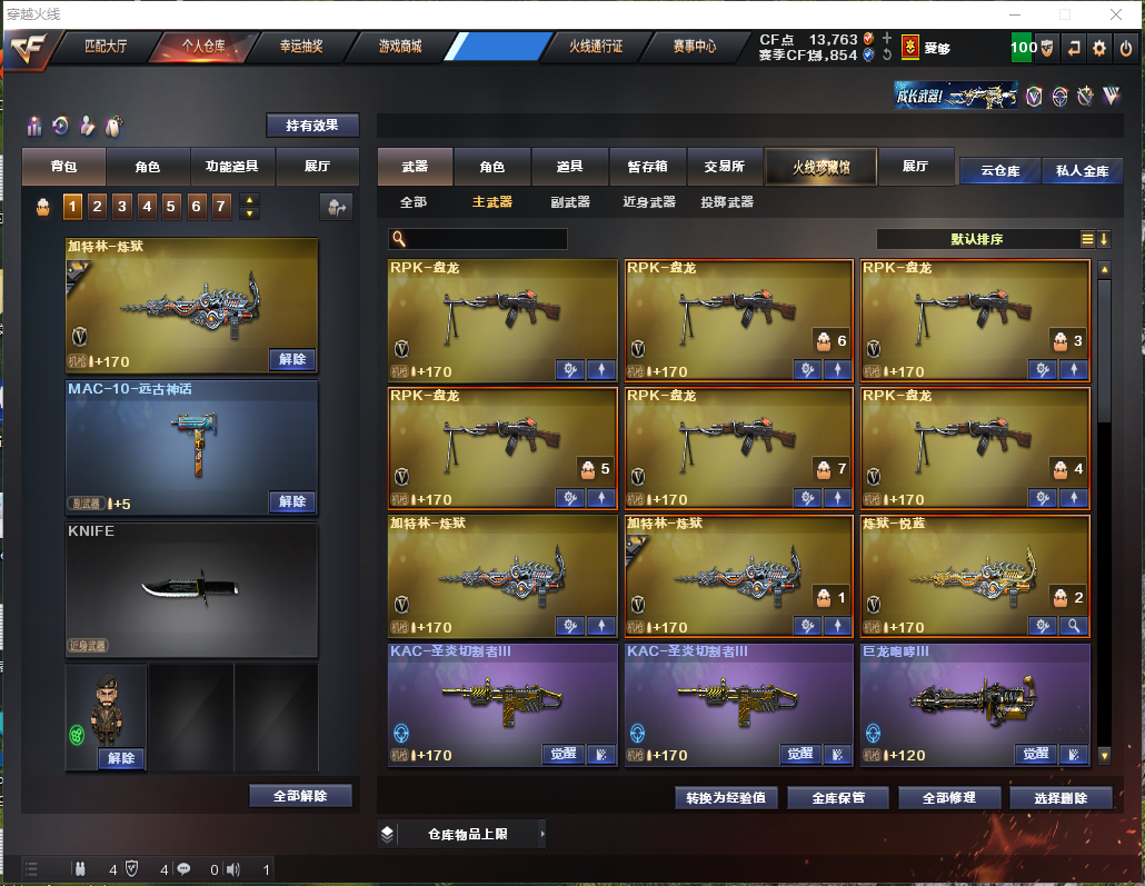 【主武器】白虎/朱雀/夜魔/雷霆/斯太尔蝴蝶/异变清道夫/生存之眼/②炼狱/炼狱悦蓝觉醒/⑥烈龙⑥盘龙/4黑骑士/雷神/2黑龙/火麒麟/2死神/超新星/金色蔷薇-古蛇迷踪/玫瑰精灵/玫瑰精灵/烈火/6毁灭/极光/裁决/朱雀大炮/电竞装甲大炮/暗月传说大炮/朱雀蛇隐宗/毁灭征服者超越Max/切割者3/巨龙咆哮3/深渊巨龙咆哮3/试炼破坏者3/KAC黑桃战神/EVO赤血龙魂/ 【副武器】COP357-雷霆/③破空枪刃夜魔/2修罗/3天神/电竞装甲柯尔特/修罗古蛇迷踪/炫金修罗/KAC-10-远古神话/ 【近身武器】⑤屠龙/尼泊尔雷霆/④修罗/麒麟刺/斩神刀雷暴/王者之峰觉醒/尼泊尔雷霆/黄金尼泊尔/黄金生化钩/③手斧镜/ 【投掷武器】迷你生化手雷/④高爆雷霆+烟闪/③高爆雷暴+烟闪/⑦电竞装甲恶棍+烟闪 【角色】沙漠玫瑰+生化四防/王者刀锋/王者葵惊若翩鸿四防/战地猎狐/樱/葵/选/狐影/蛇隐宗/ 【皮肤】炼狱-末日审判皮肤/雷神-耀金皮肤/屠龙-春桃皮肤 【音效卡】黑骑士音效卡 【道具】紫金大元首/全背包/vip6/变异宝贝/灵魂忍者/疯狂宝贝/妖姬/迷雾幽灵/妖姬/绿巨人/步枪/冲锋枪/手枪/机枪/狙击枪/生化弹夹/救世主黑桃战神皮肤/地狱终结者妲己皮肤/幻影猎手幻影猎人皮肤/生化爆破全装;沙漠玫瑰,RPK-盘龙,Scar Light-白虎,