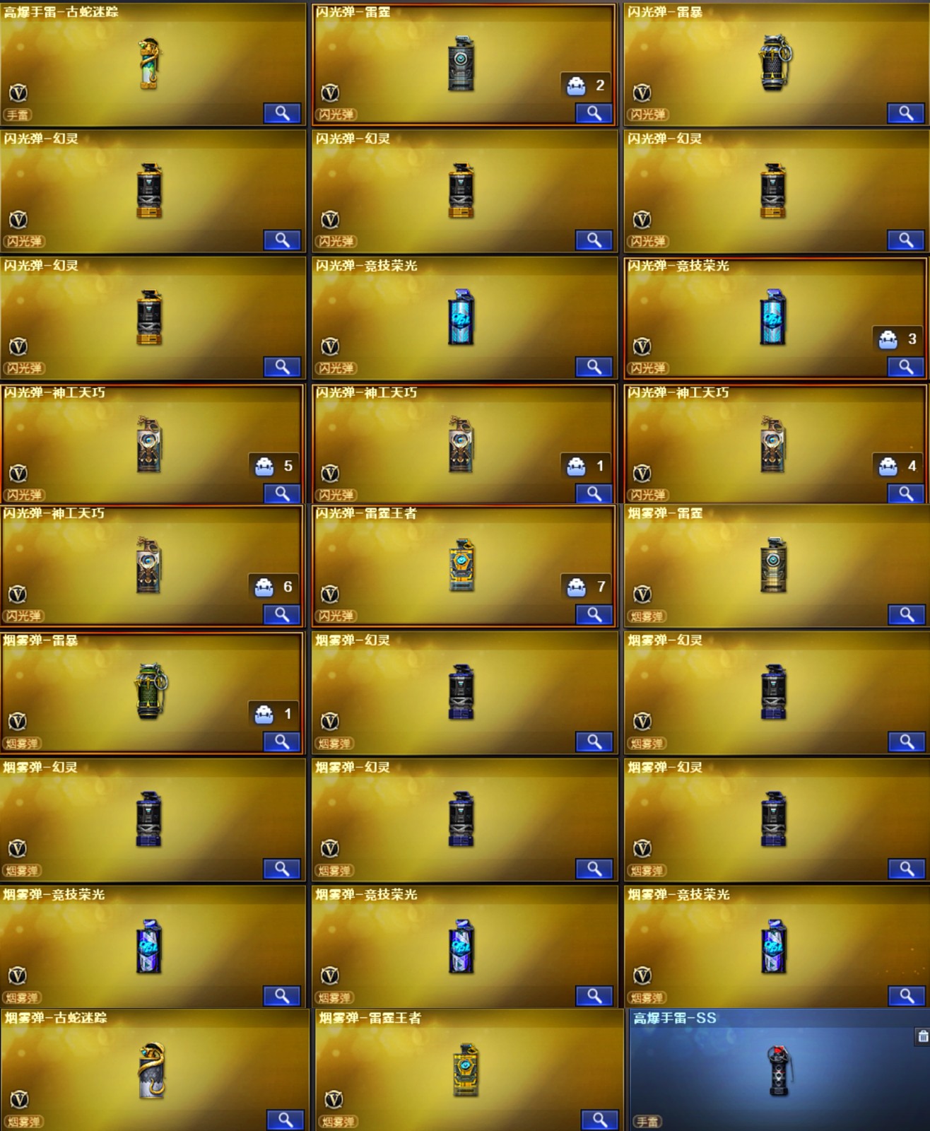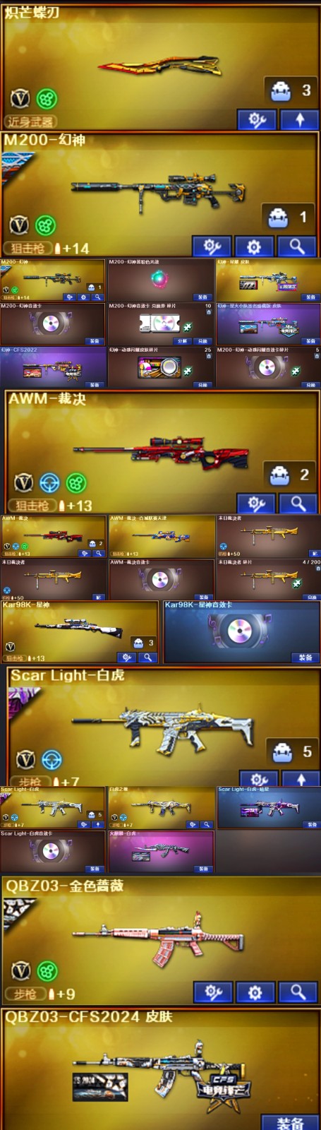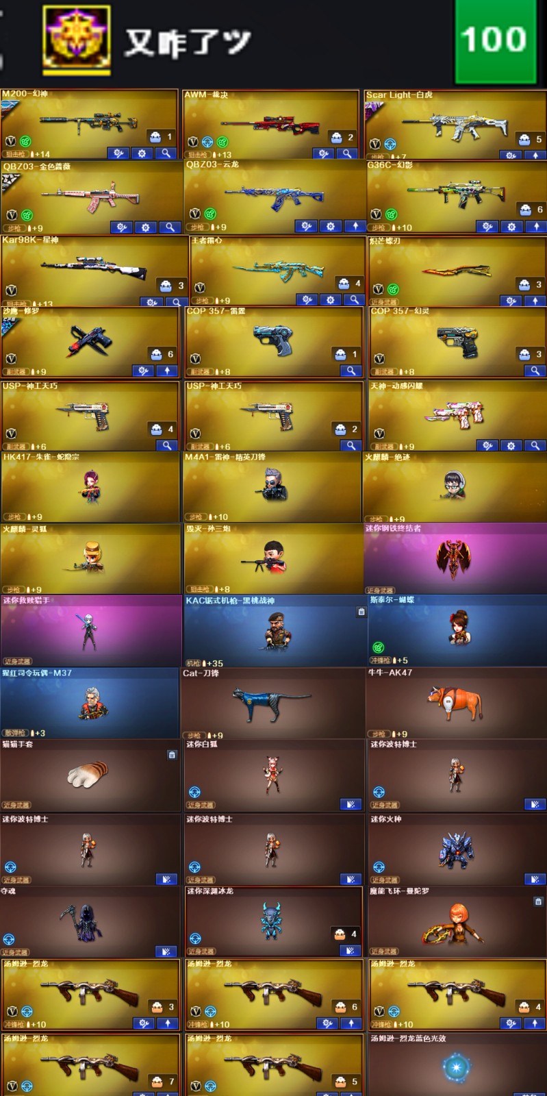 王者武器:炫金毁灭;王者霜心;烟雾弹-雷霆王者-觉醒版;闪光弹-雷霆王者-觉醒版 英雄武器:Barrett-暗月传说;G36C-幻影;Kar98K-星神;汤姆逊-烈龙;Scar Light-白虎;雷霆之契;烟雾弹-竞技荣光;闪光弹-竞技荣光;高爆手雷-竞技荣光;M4A1-雷神;炽芒蝶刃;M4A1-黑龙;AWM-裁决;黑骑士-海王;手雷-云海游龙;QBZ03-金色蔷薇;烟雾弹-幻灵;闪光弹-幻灵;高爆手雷-幻灵;COP 357-幻灵;烈火-动感闪耀;屠龙-动感闪耀;天神-动感闪耀;手雷-动感闪耀;高爆手雷-神工天巧;USP-神工天巧;闪光弹-神工天巧;沙鹰-修罗;AK47-火麒麟;M200-幻神;M4A1-黑骑士;擎天;高爆手雷-雷暴;烟雾弹-雷暴;闪光弹-雷暴;雷霆之锋;高爆手雷-雷霆;烟雾弹-雷霆;闪光弹-雷霆;Barrett-毁灭;麒麟刺;龙啸;屠龙 角色:葵;电竞教官-云悠悠;传说艾莉莎;隼;潘多拉;曼陀罗;幻影;雷霆-β;复仇者;堕天使;活力灵狐;兰;威锋;陈龙野-X;新斯沃特-英特尔;娜塔莎;救世复仇;救世主;精英部队;灵狐者;灵狐者-黄金海岸;妩媚妖姬;影武者-X;雷豹;龙;炽芒蝶刃,隼,电竞教官-云悠悠,传说艾莉莎,QBZ03-金色蔷薇,G36C-幻影,M200-幻神,