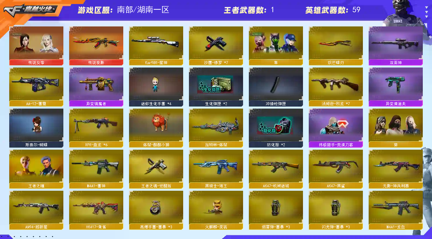 极品号 镇魔者 炼狱酷酷小狮 蝴蝶刀 传说女帝 隼 星神 清道夫 传说夜影 6盘 7烈蝴蝶 9修罗 堕天神雷暴3套 朱雀 勇往直前包 生化弹夹都有 烟雾头;炽芒蝶刃,传说女帝,隼,RPK-盘龙,Kar98K-星神,